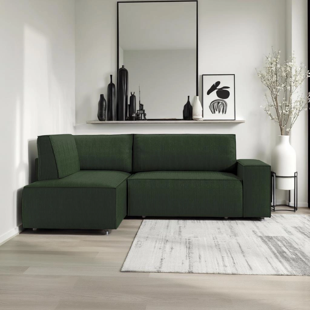 Molde L levá zaujme širokým, moderním sedákem a výraznou manšestrovou látkou, která nejen skvěle vypadá, ale je i příjemná na dotek. Rozkládací rohová sedačka je ideální volbou do obývacího pokoje, kde je důležitá kombinace praktičnosti a stylového vzhledu. Perfektně zapadne do interiérů ve skandinávském nebo moderním stylu a stane se centrálním prvkem vašeho domova.