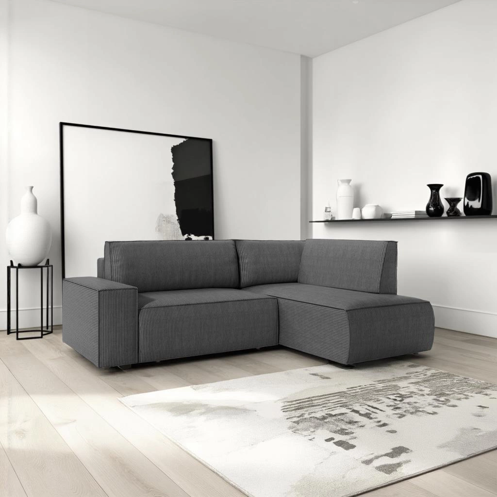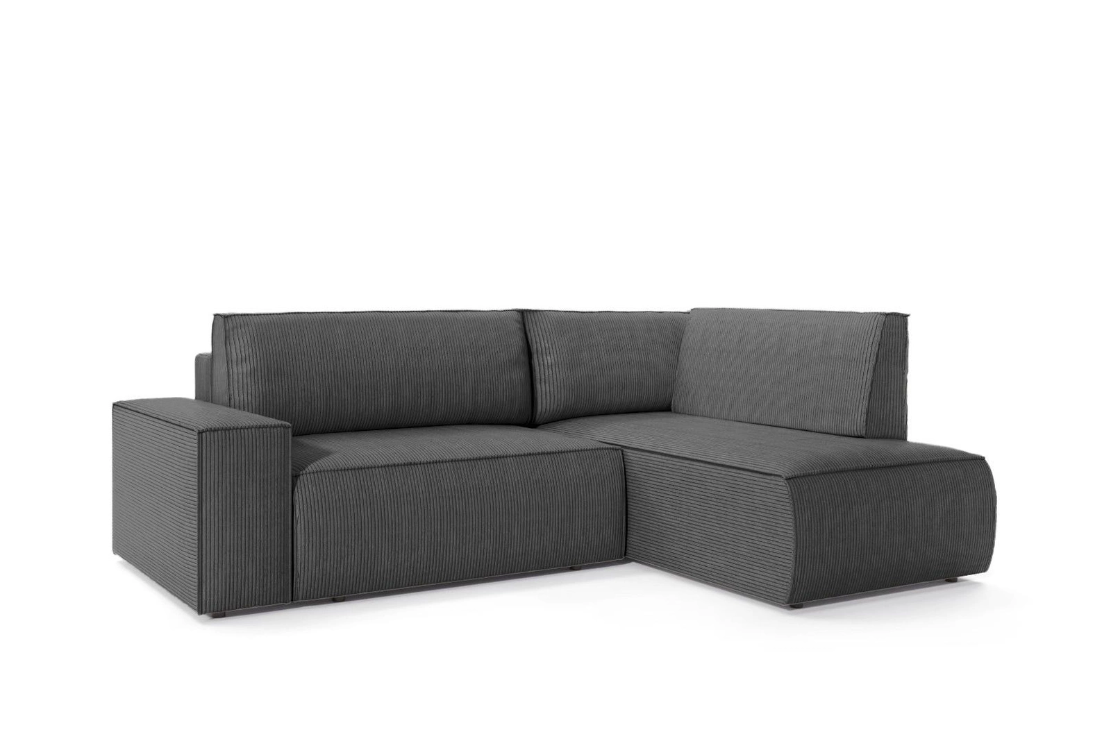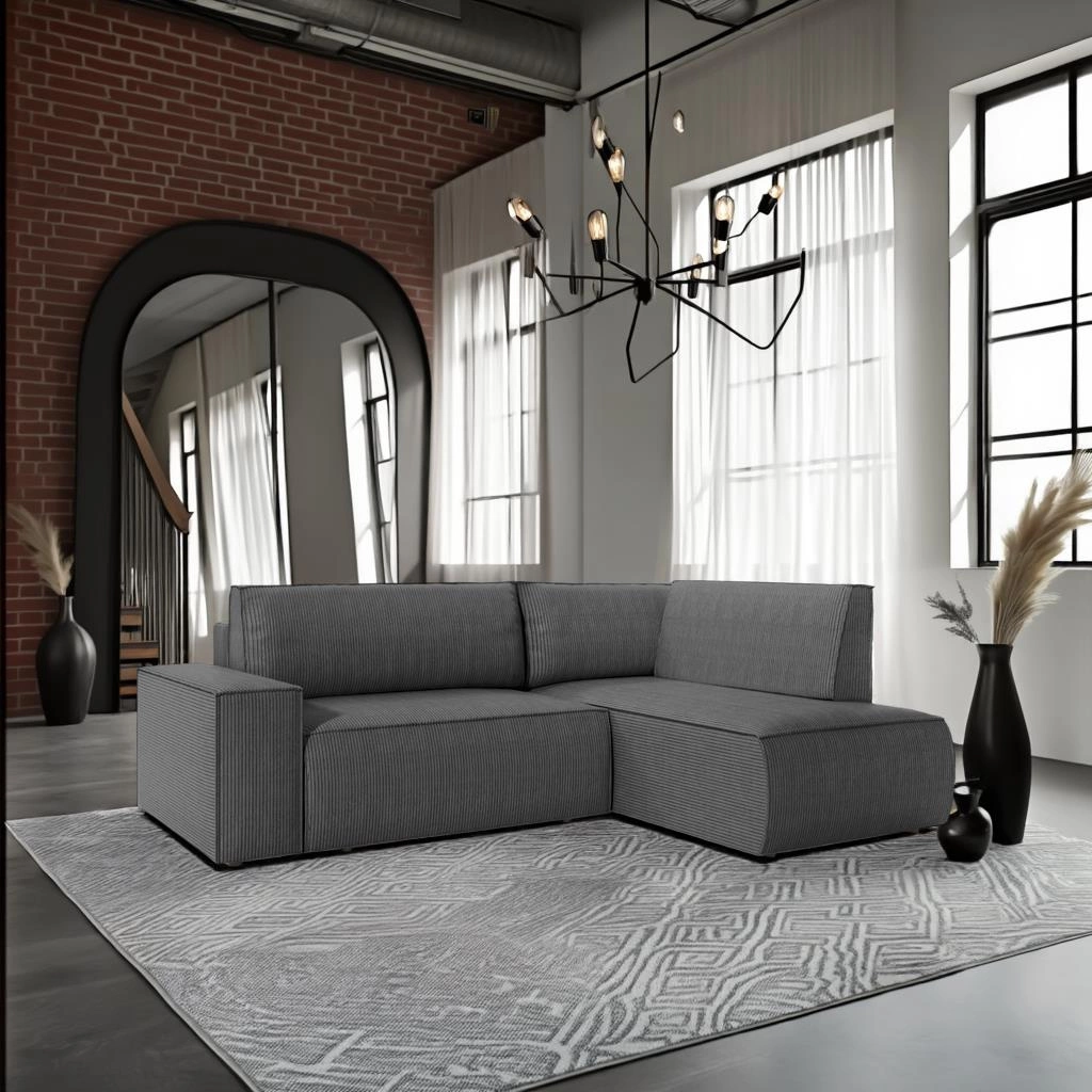 Rohová sedačka s rozkládací funkcí Molde L pravá od značky Intesi je moderní odpočinkový nábytek, který spojuje pohodlí, praktičnost a jedinečný manšestrový design. Její šedá barva dokonale odpovídá současným trendům v zařizování obývacích pokojů a promyšlený tvar do L skvěle zapadne jak do menších, tak i větších prostor. Spací plocha o rozměrech 200×135 cm a úložný prostor na lůžkoviny dělají z této rohové sedačky mimořádně funkční řešení pro každodenní použití.