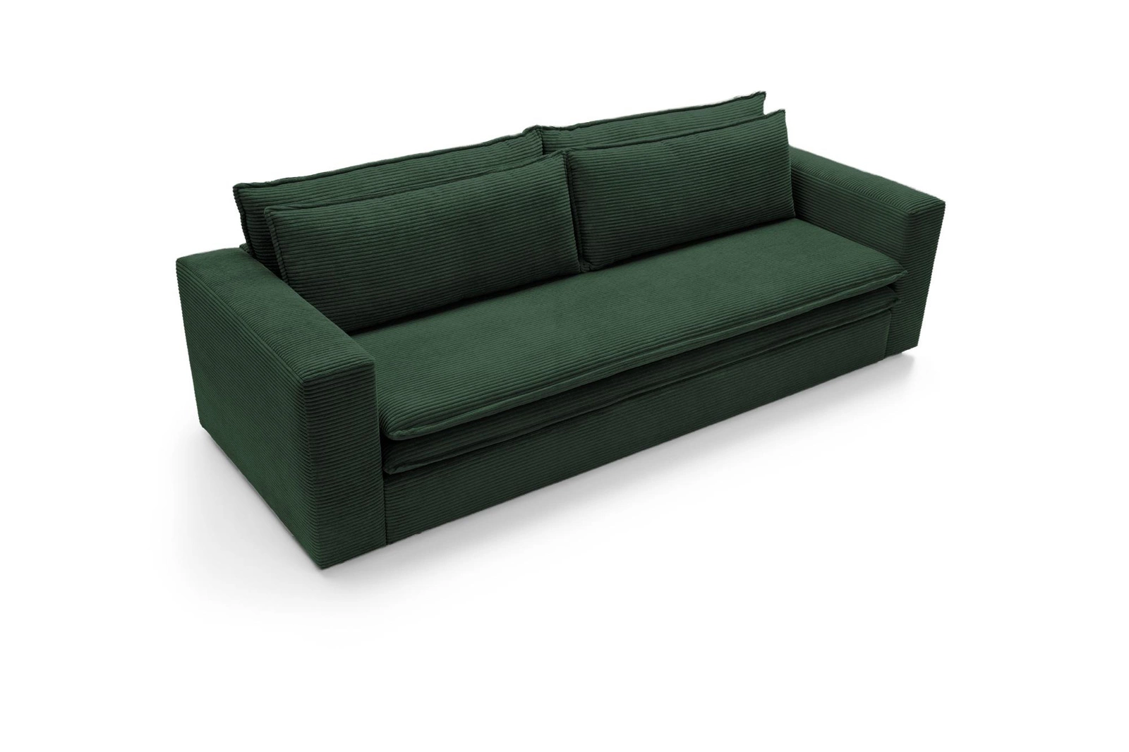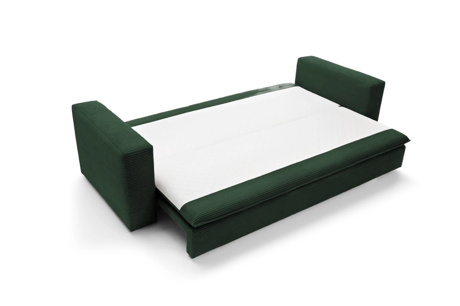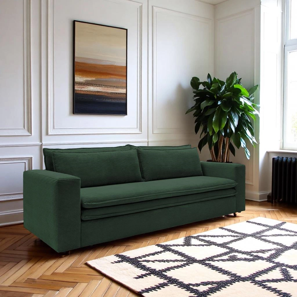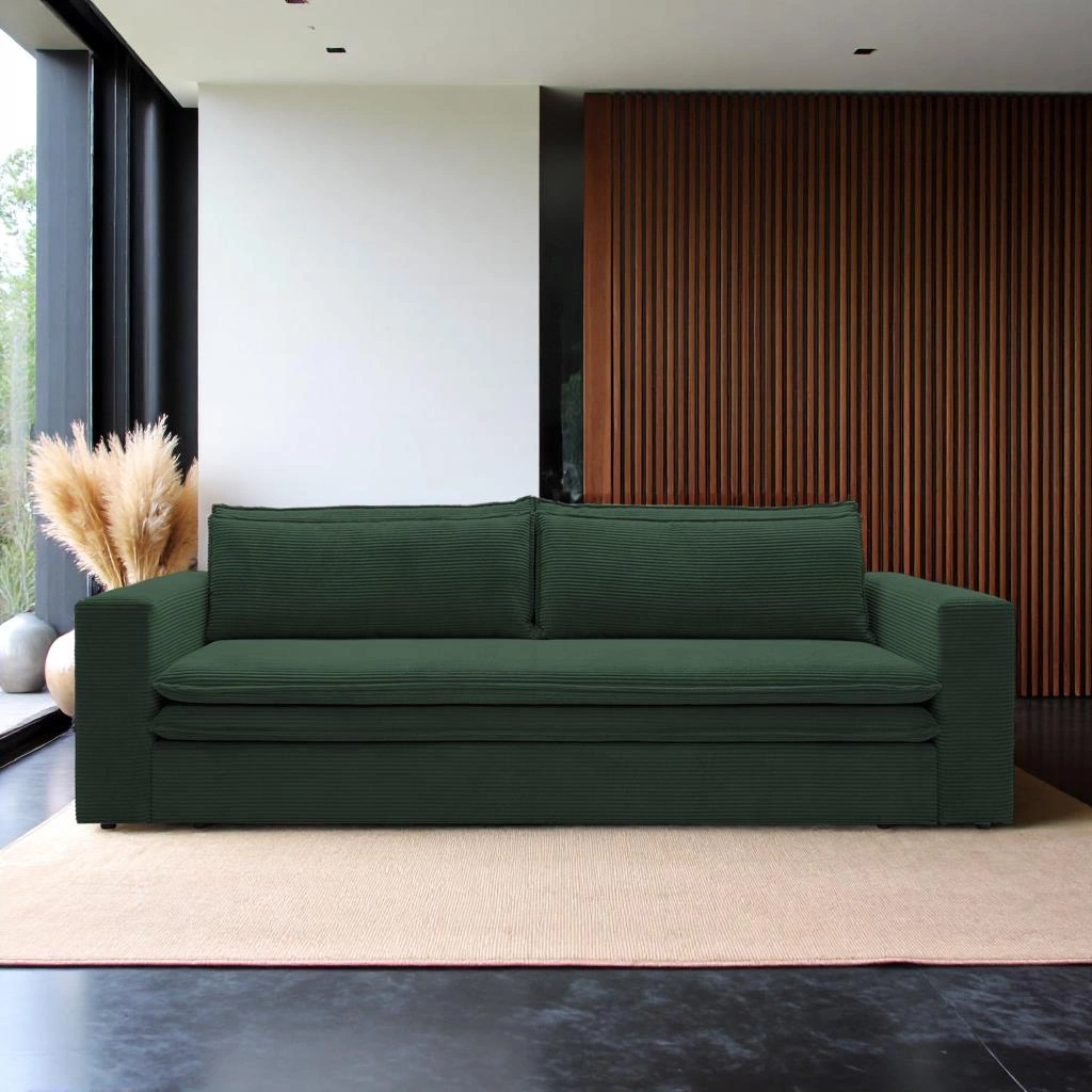 Rozkládací pohovka s funkcí spaní Ulnes od značky Intesi je ideální volbou pro ty, kteří hledají spojení moderního designu, pohodlí a praktických řešení pro každodenní život. Zelená manšestrová látka s jemným sametovým povrchem obklopuje prostorné sedátko pro tři osoby, zatímco mechanismus klik-klak umožňuje během chvilky přeměnit pohovku na pohodlné lůžko o ploše 200×140 cm. Další úložný prostor na lůžkoviny zajišťuje, že pohovka perfektně zapadne jak do obývacího pokoje, tak do studentského či dětského pokoje – nabídne místo k odpočinku i každodennímu spaní.