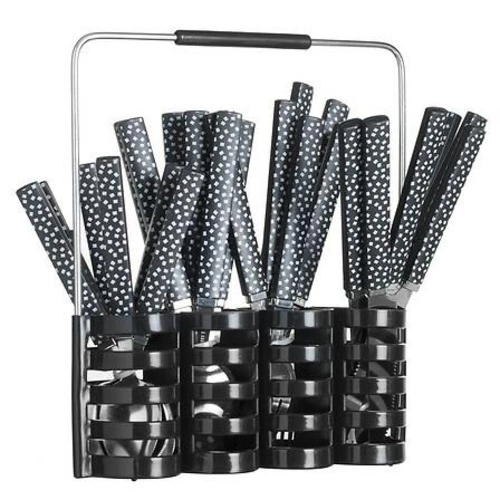 Sada příborů Géo nabízí až 24 kusů, které uspokojí potřeby celé rodiny i hostů. V balení najdete nože, vidličky, polévkové lžíce i lžičky – vše potřebné pro každodenní stolování i oslavy. Praktický stojan umožňuje snadný přístup ke všem příborům a udržuje pořádek na stole či v kuchyni. Dobře vyvážené rukojeti zajišťují komfortní používání a kompaktní rozměry stojanu (výška 24,3 cm, šířka 7 cm, hloubka 22,7 cm) umožní snadné umístění kdekoliv v kuchyni.