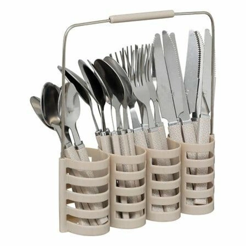 Sada jídelních příborů 24 kusů v béžové barvě se stojanem Géo od značky 5five simply smart je elegantní volbou, která přináší moderní styl do každé jídelny. Komplet vyrobený z odolného kovu a plastu v jemném béžovém odstínu je ideální pro každodenní stolování i rodinná setkání. Praktický stojan umožňuje snadnou organizaci a pohodlné uložení všech částí, zároveň podtrhuje estetiku kuchyňské linky.