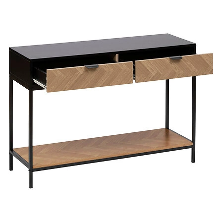 Konzole Chevrons od značky Atmosphera je moderní konzolový stolek v loftovém stylu, který dokonale spojuje funkčnost s výrazným designem. Deska o šířce 110 cm a hloubce 35 cm poskytuje praktický odkládací prostor, zatímco pevná ocelová konstrukce zaručuje stabilitu. Nábytek je vybaven dvěma prostornými zásuvkami a dodatečnou policí, díky kterým snadno udržíte pořádek v předsíni, obývacím pokoji nebo ložnici.