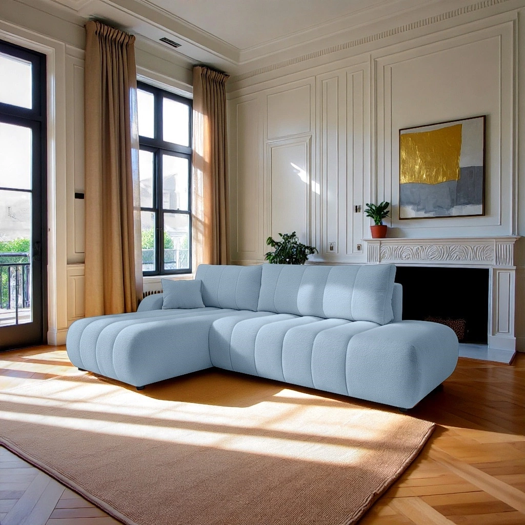 Levý rohový gauč s rozkládací funkcí Hobro od značky Intesi je moderní čalouněný nábytek, který spojuje pohodlí každodenního odpočinku s praktickými řešeními. Vyniká měkkou, příjemnou na dotek modrou látkou, šířkou až 276 cm a rozkládací funkcí s velkou spací plochou 145×212 cm. Model je vybaven také prostorným úložným prostorem na ložní prádlo, což z něj činí ideální volbu do obývacího pokoje, kde je důležitá pohodlnost i funkčnost.
