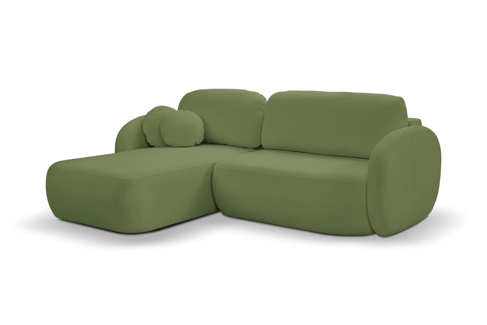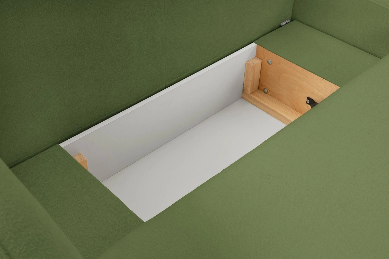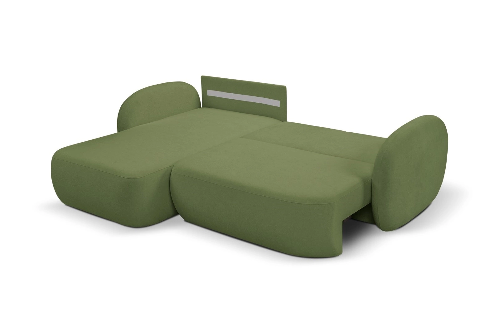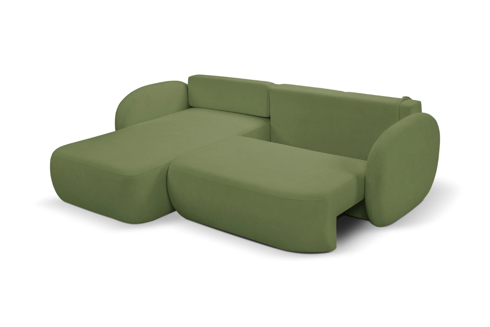 Rohová rozkládací pohovka levá Salby zelená moderní do obýváku s úložným prostorem