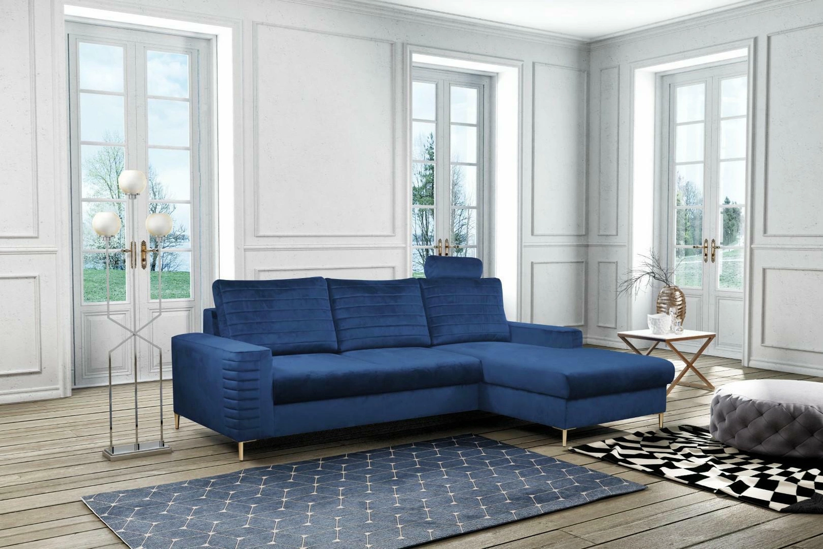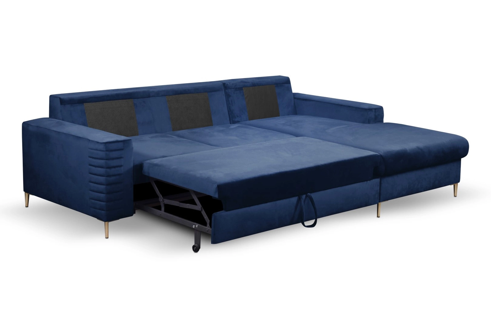 Rohová sedačka s rozkládací funkcí Hald od značky Intesi je kombinací moderního designu, komfortního sametového potahu a praktických řešení pro váš obývací pokoj. Model v elegantní, hluboké námořnické modři, s pravostranným uspořádáním a zlatými kovovými nožkami, nabízí prostor pro každodenní odpočinek i pohodlné spaní o rozměrech 140×212 cm. Díky úložnému prostoru na lůžkoviny je roh nejen stylový, ale také mimořádně funkční.