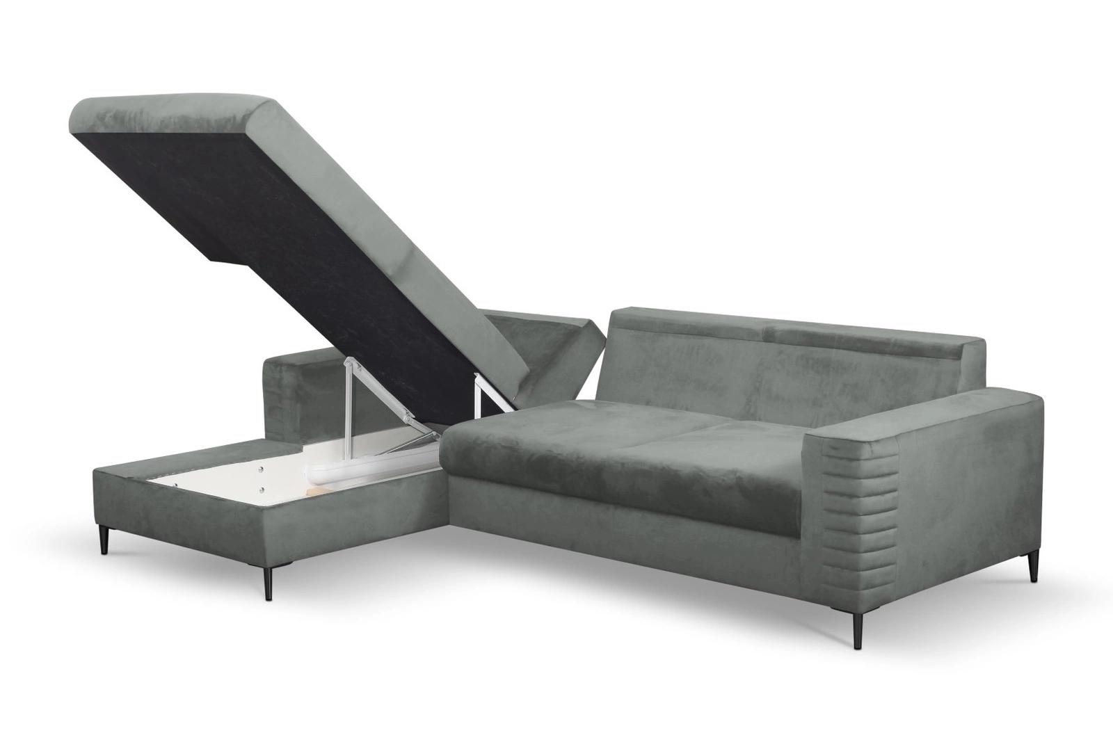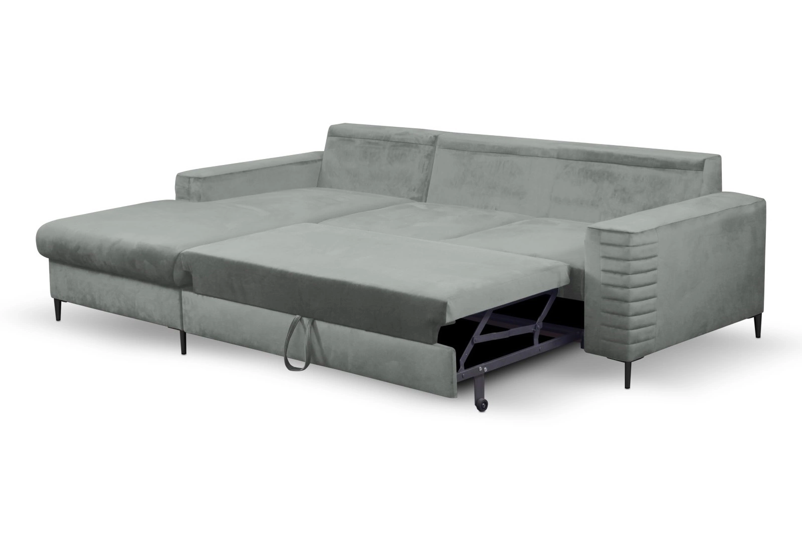 Moderní rohová rozkládací sedačka Hald levá šedá sametová do obýváku s úložným prostorem