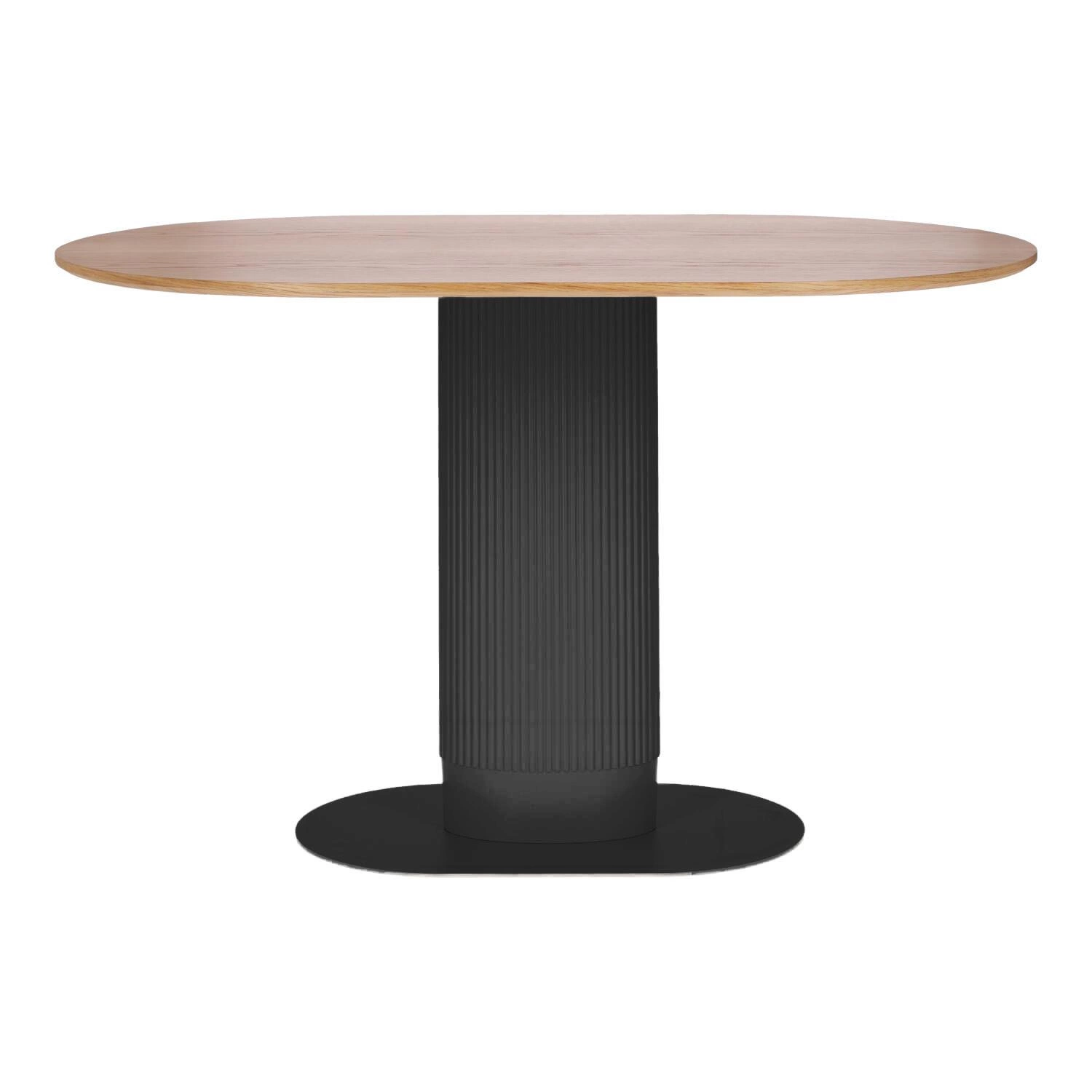 Jídelní stůl Maxim značky Intesi je moderní kus nábytku navržený pro milovníky minimalistického designu. Oválná deska o rozměrech 120×70 cm, zakončená přírodní dubovou dýhou, spočívá na výrazné černé kovové noze. Díky univerzální výšce 75 cm se stůl skvěle hodí nejen do jídelny, ale také do kuchyně, restaurace či kavárny. Kombinuje elegantní vzhled s každodenní funkčností.