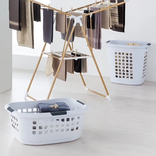 Plast, ze kterého je tento koš na prádlo vyroben, je odolný vůči vlhkosti a snadno se čistí – stačí jej otřít vlhkým hadříkem a vypadá jako nový. Další předností jsou tři ergonomická držadla, která zajišťují pohodlné přenášení koše bez ohledu na jeho hmotnost. Nízká výška 27,1 cm umožňuje snadné zasunutí pod desku nebo do skříňky, což šetří místo a udržuje pořádek.