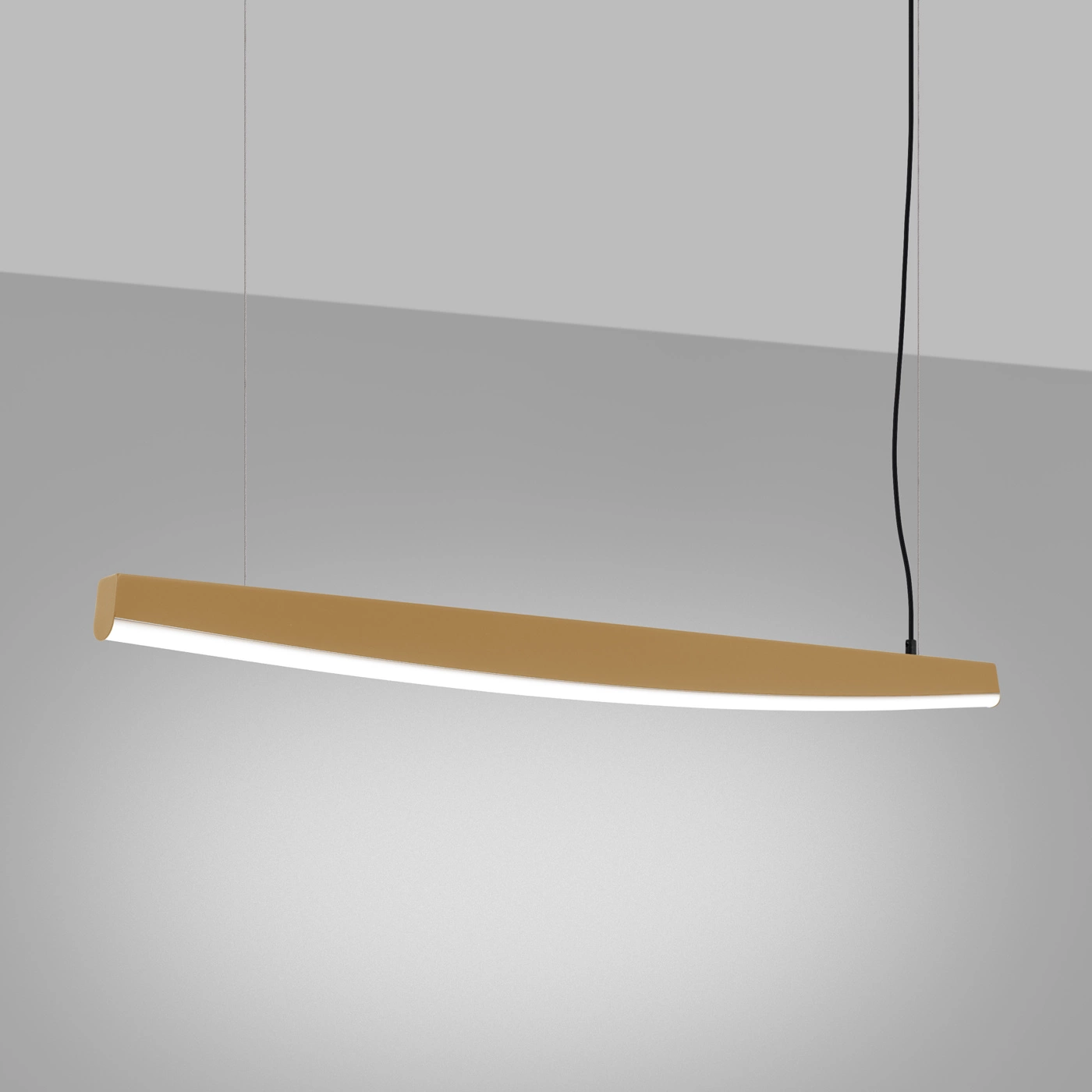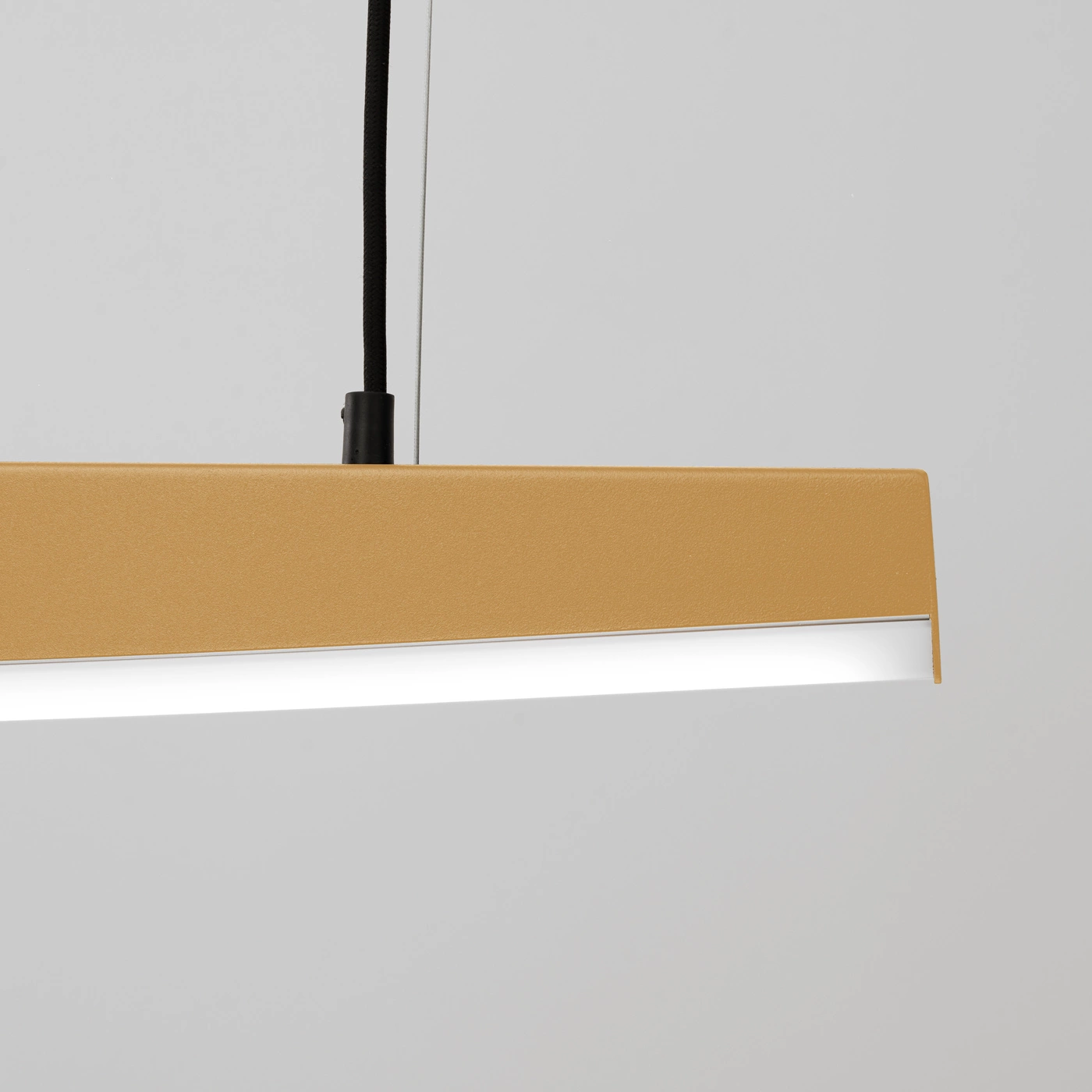 Závěsné svítidlo JORUN 120 od značky Thoro je moderní LED osvětlení o délce 120 cm, vyrobené z oceli s elegantním zlatým povrchem. Díky úzkému tvaru a integrovanému LED zdroji (22W, 4000K) poskytuje lampa rovnoměrné, přirozené světlo, které je ideální nad jídelní stůl, kuchyňský ostrůvek nebo do obývacího pokoje. Nastavitelná výška zavěšení (až do 210 cm) umožňuje plné přizpůsobení potřebám vašeho interiéru.