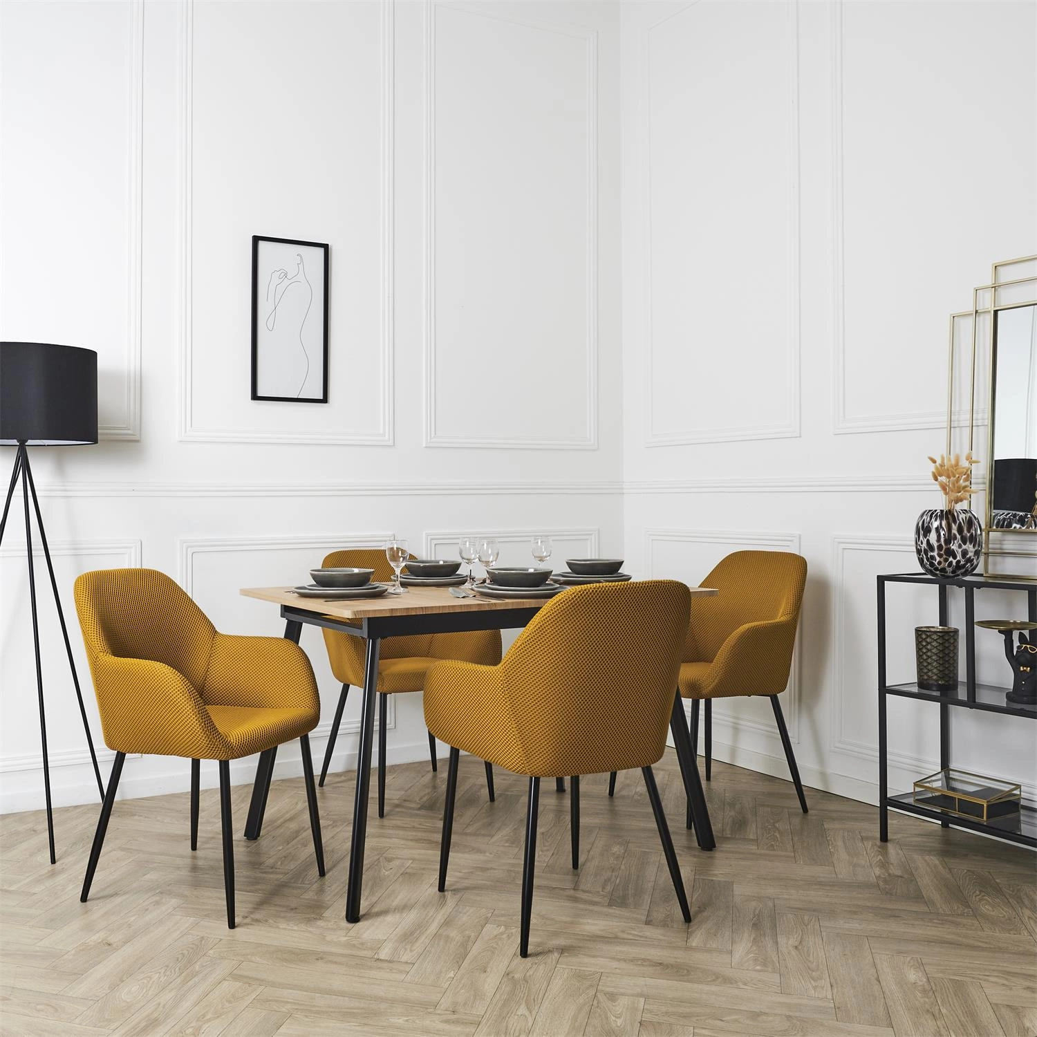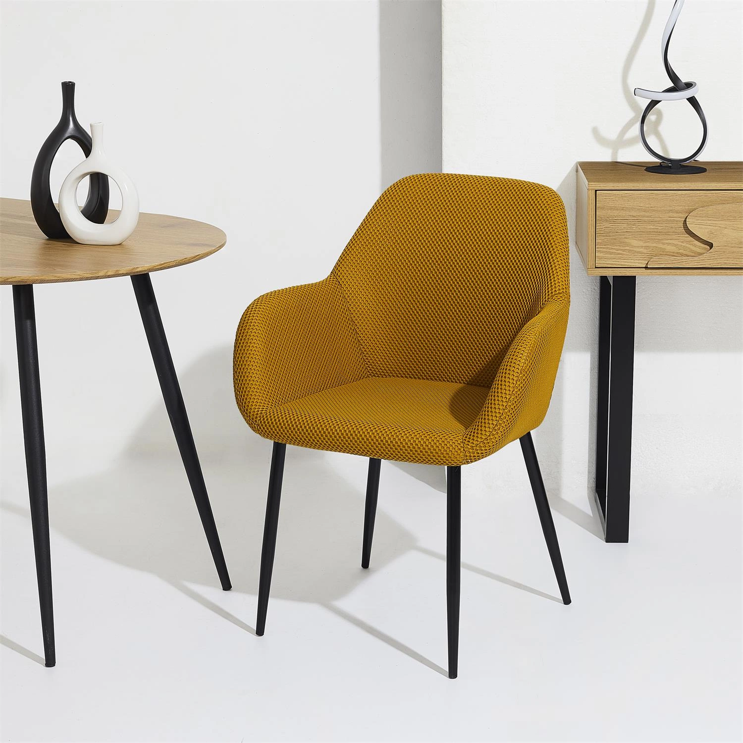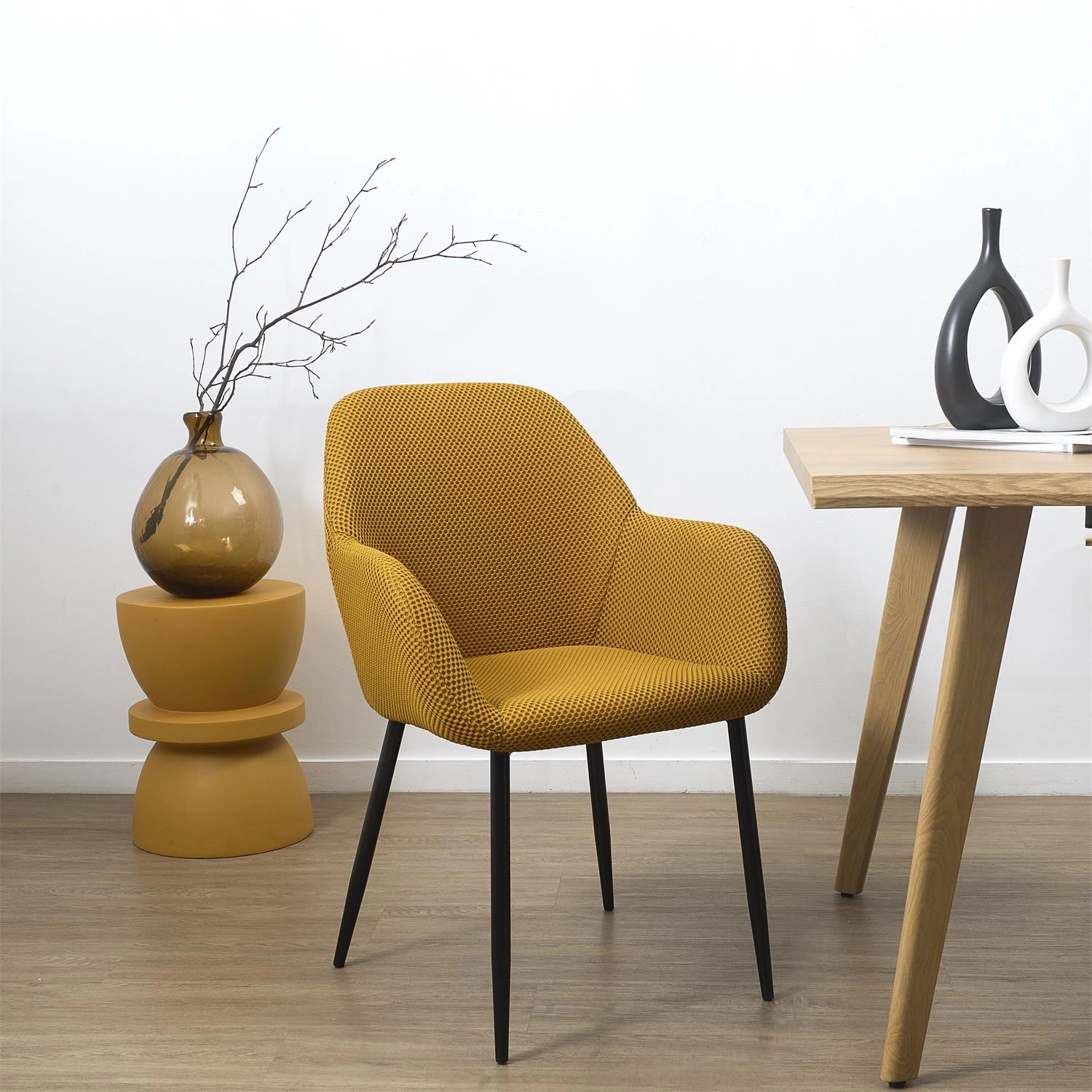 Čalouněná židle Lavia Intesi žlutá je moderní kus nábytku, který okouzlí výraznou barvou a pohodlným sedákem s opěrkami na ruce. Elegantní kombinace žluté látky s černou, polomatnou kovovou podnoží dělá z tohoto modelu ideální židli do jídelny, obývacího pokoje nebo domácí pracovny. Vysoké nohy usnadňují úklid a ergonomická výška sedu (46,5 cm) zaručuje pohodlí při každodenním používání.