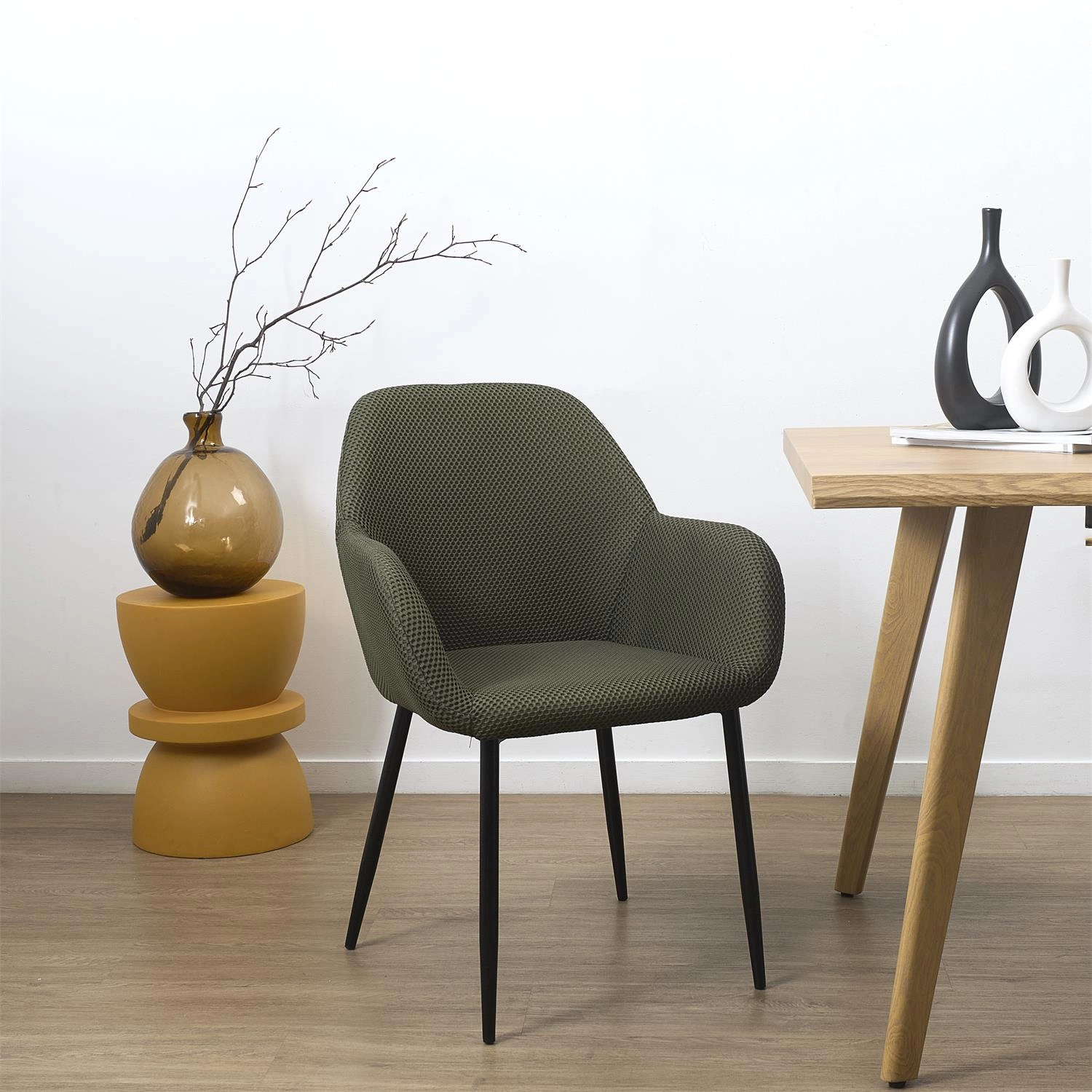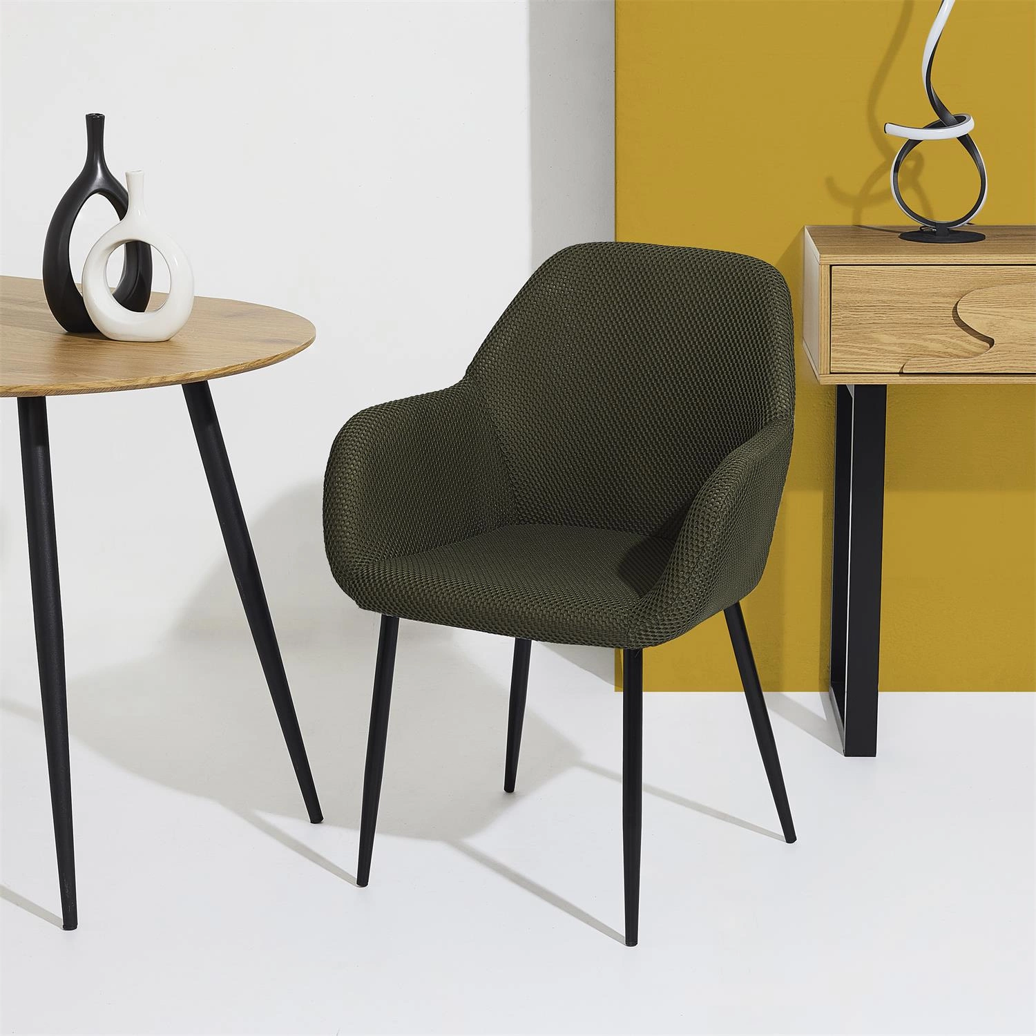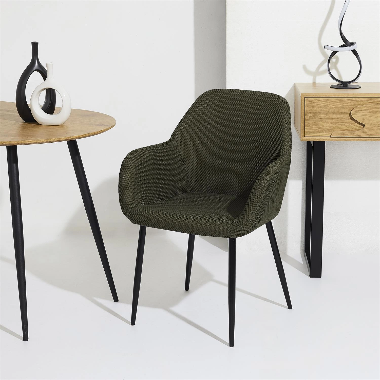 Hledáte-li židli do jídelny nebo stylové křeslo do obývacího pokoje, Lavia vás okouzlí svým současným designem a univerzálním použitím. Tón zelené khaki vnáší do prostoru svěžest a jemný, přesto výrazný barevný akcent. Vysoké, štíhlé nohy v černém polomatném provedení podtrhují lehkost konstrukce a umožňují snadný průjezd robotického vysavače pod židlí.
