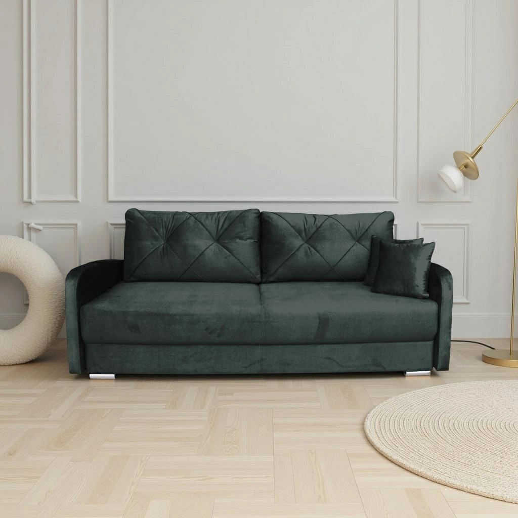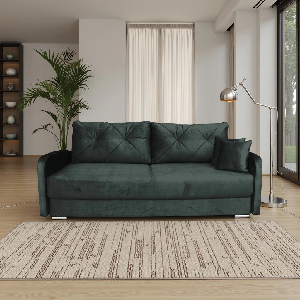 Rozkládací pohovka s funkcí spaní Urduna od značky Intesi je ideální volbou pro ty, kteří hledají univerzálnost, pohodlí a styl v jednom kuse nábytku. Model v svěží zelené barvě spojuje skandinávskou jednoduchost s praktickými řešeními. Měkká tkanina, stabilní dřevěná konstrukce a šířka 205 cm zaručují, že pohovka perfektně poslouží jako místo pro každodenní odpočinek i noční spánek.