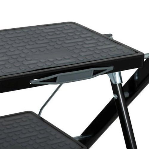 - Černý dvoustupňový skládací žebřík je robustní a stabilní nástroj s maximální nosností 150 kg.