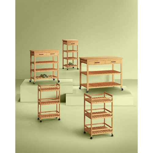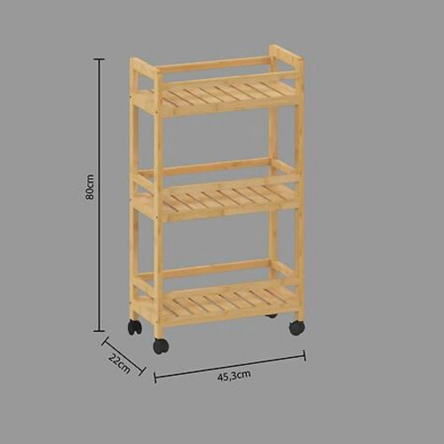 Dřevěný kuchyňský vozík Linha 3úrovňový od značky 5five simply smart je praktický, mobilní kus nábytku z bambusového dřeva v přírodním odstínu a boho stylu. Je vybaven třemi prostornými policemi a kolečky pro snadné přesouvání, což umožňuje pohodlné ukládání drobností v kuchyni, koupelně nebo jiných místnostech. Díky kompaktním rozměrům (výška 80 cm, šířka 45,3 cm, hloubka 22 cm) se skvěle hodí i do menších prostor.