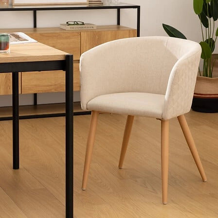 Židle Marlo dokonale vystihuje skandinávský design – béžové čalounění ladí s přirozeným odstínem kovových nohou a matné, prošívané provedení dodává celku útulnost. Minimalistický tvar i univerzální barva umožňují snadné začlenění do různých interiérů – od světlých, moderních prostor až po klasické místnosti. Tato čalouněná židle přináší do domova teplo a estetický klid.