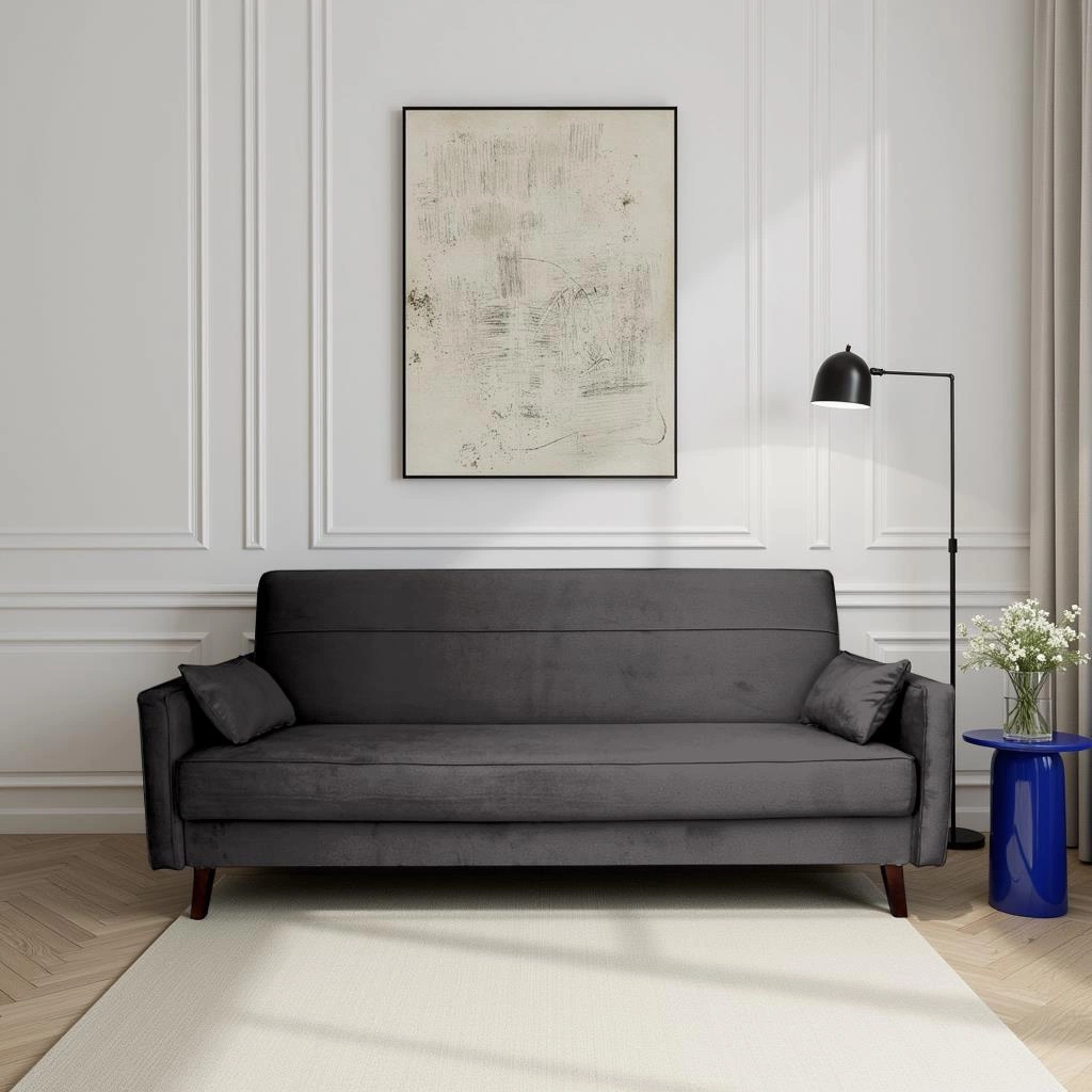 Rozkládací pohovka s funkcí spaní Izoria od značky Intesi je třímístný kus nábytku v nadčasovém vintage stylu, vyrobený z měkké, hydrofobní látky Vogue 16 v šedém odstínu. Šířka 218 cm a plocha na spaní 192×120 cm nabízí pohodlný prostor jak pro každodenní odpočinek, tak i pro komfortní spánek. Model je vybaven praktickým úložným prostorem na lůžkoviny a stabilními černými dřevěnými nohami, které podtrhují retro charakter pohovky a usnadňují úklid pod nábytkem.