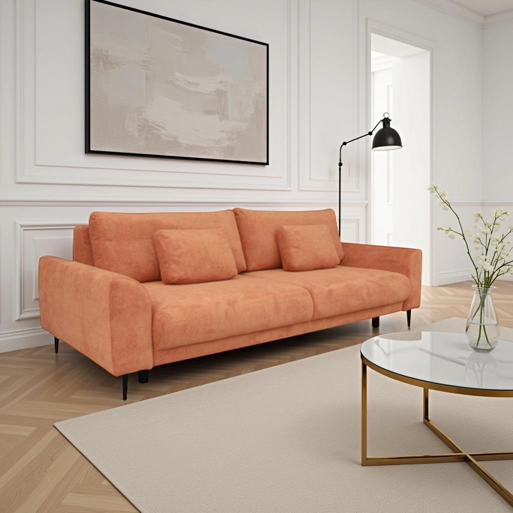 Rozkládací pohovka Ferrero Intesi je perfektní volbou pro náročné – ideální do moderního obývacího pokoje, kde je důležitý jak komfort, tak výrazný styl. Vneste do svého domova teplo terakotové barvy a užijte si flexibilitu každý den.