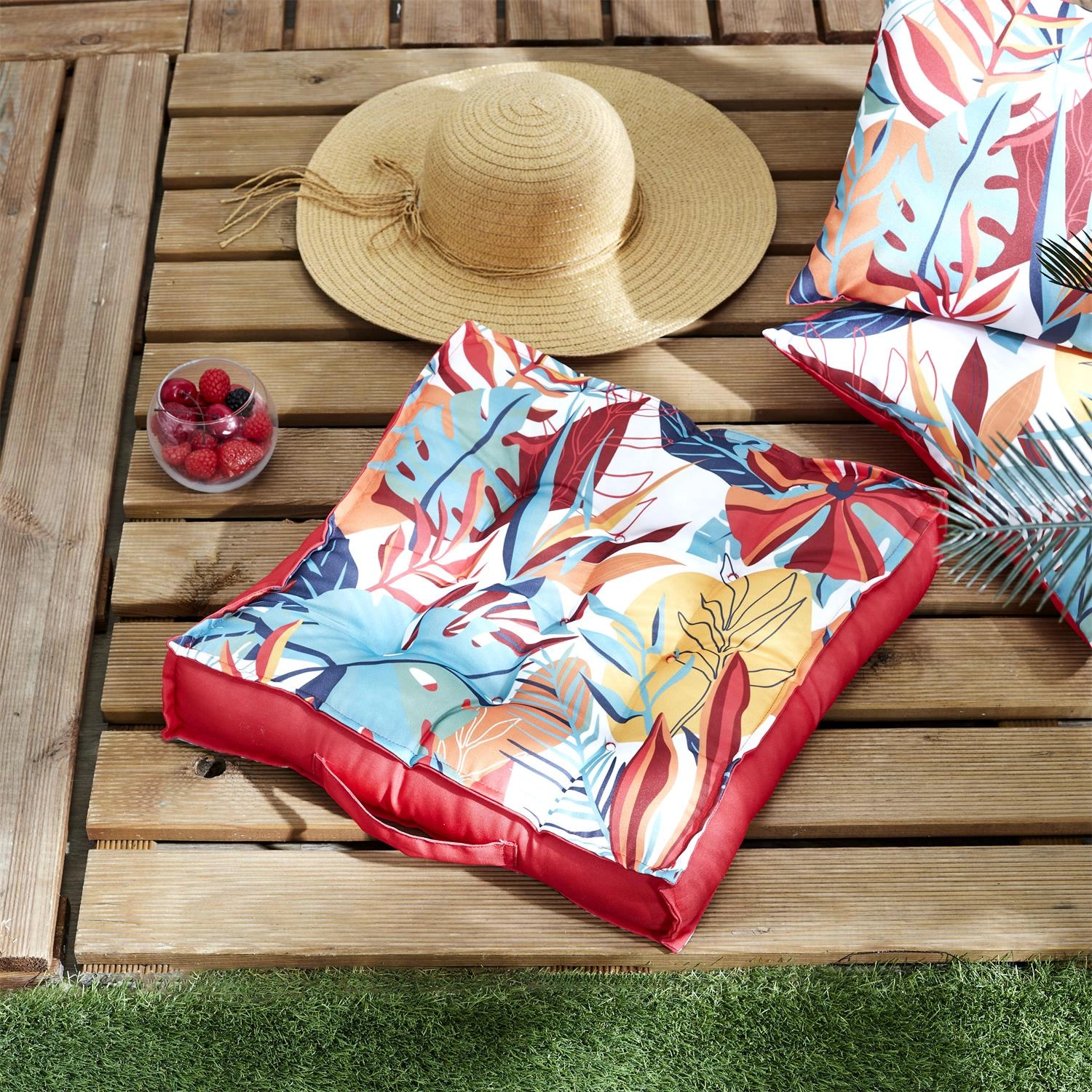 Zahradní polštář Exotic paradise od značky Intesi je moderní čtvercový doplněk o rozměrech 40×40×9,5 cm, navržený speciálně pro použití na terase, balkoně nebo v zahradě. Zaujme hydrofobním polyesterovým potahem, výrazným, vícebarevným květinovým vzorem a pohodlnou výplní, která zajišťuje maximální komfort při sezení na čerstvém vzduchu. Snímatelný potah umožňuje snadnou údržbu a udržení polštáře v čistotě.
