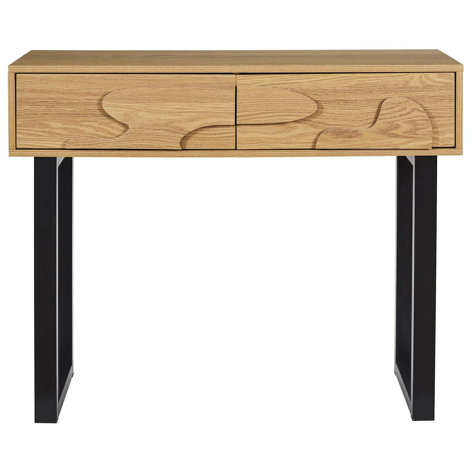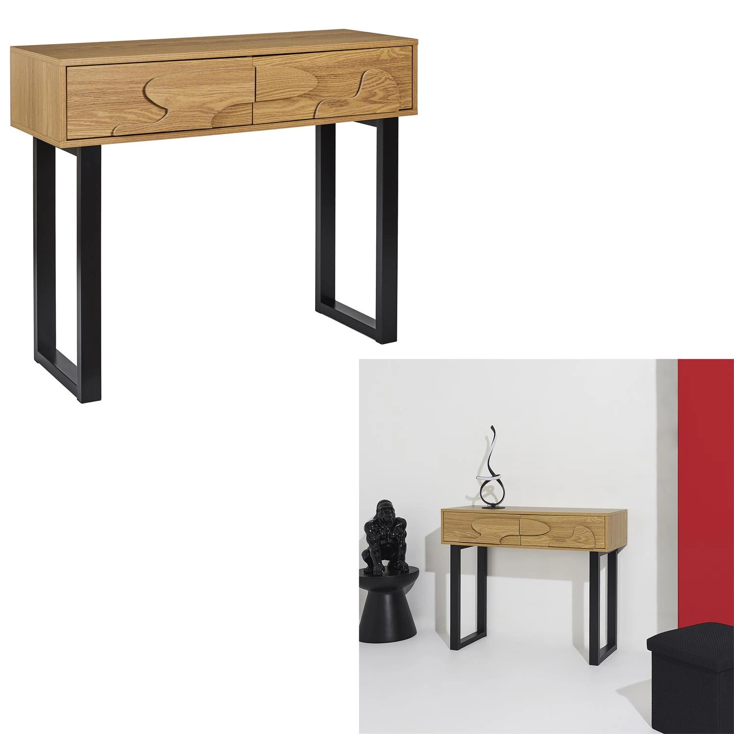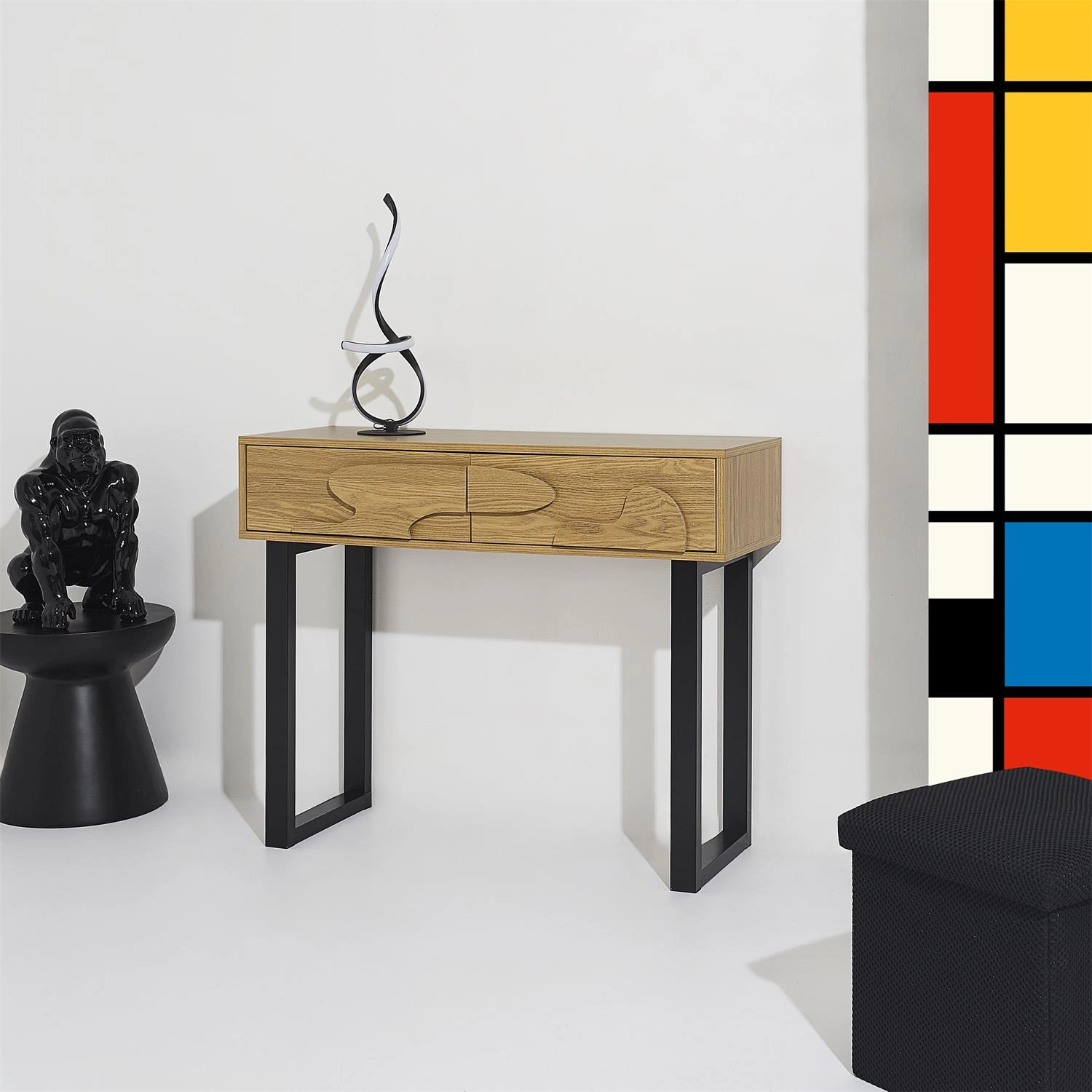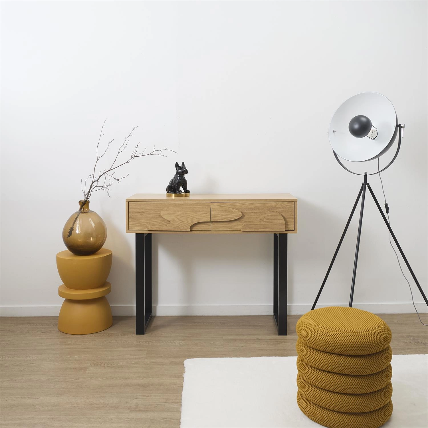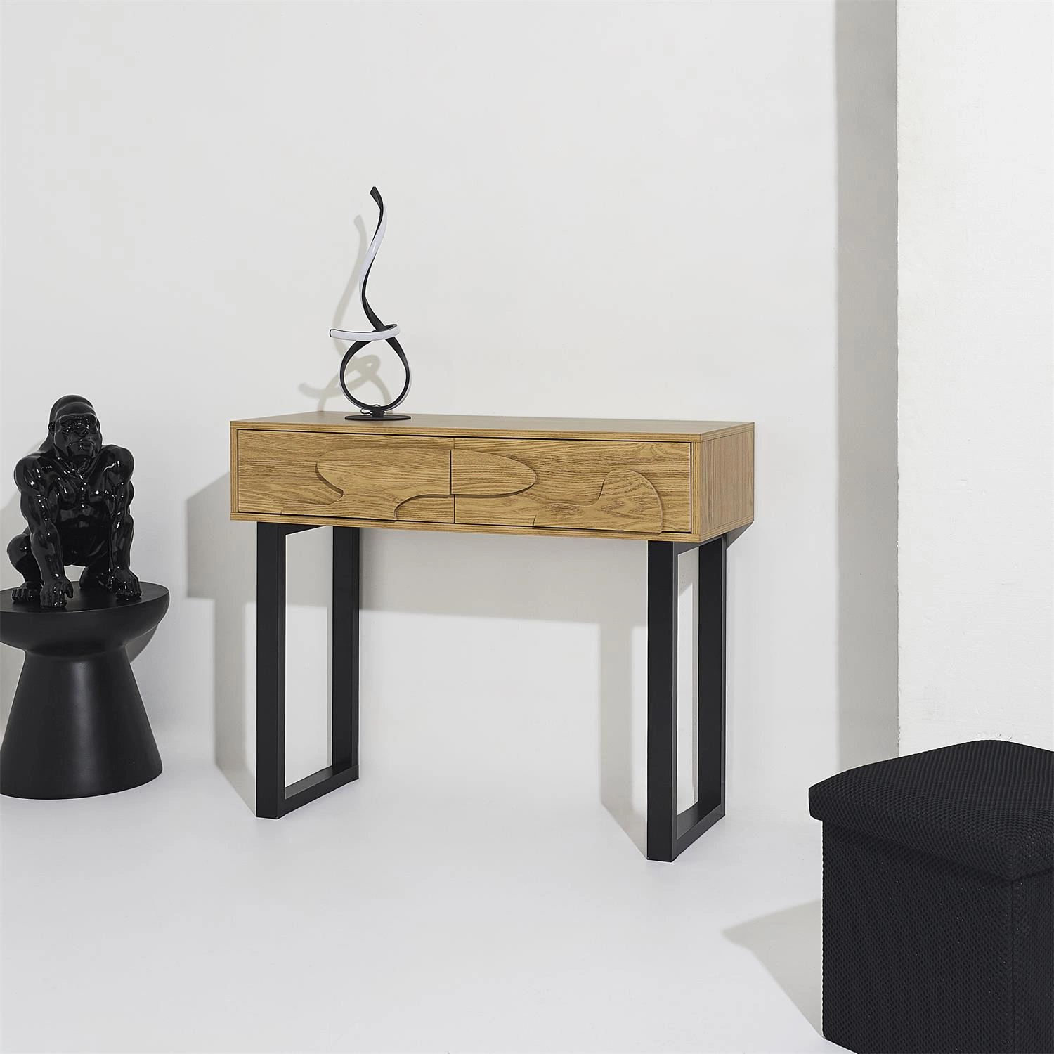 Konzole Calypso od značky Intesi je moderní konzolový stolek v boho japandi stylu, který spojuje přírodní dubový odstín s elegantní černou podnoží. Je vybavena dvěma praktickými zásuvkami, obdélníkovou deskou o šířce 100 cm a jemně zdobenými čely, takže se skvěle hodí jako konzole do předsíně, obývacího pokoje nebo ložnice. Stabilní kovová základna na lyžinách a polomatná povrchová úprava zaručují dlouhou životnost a snadnou údržbu.
