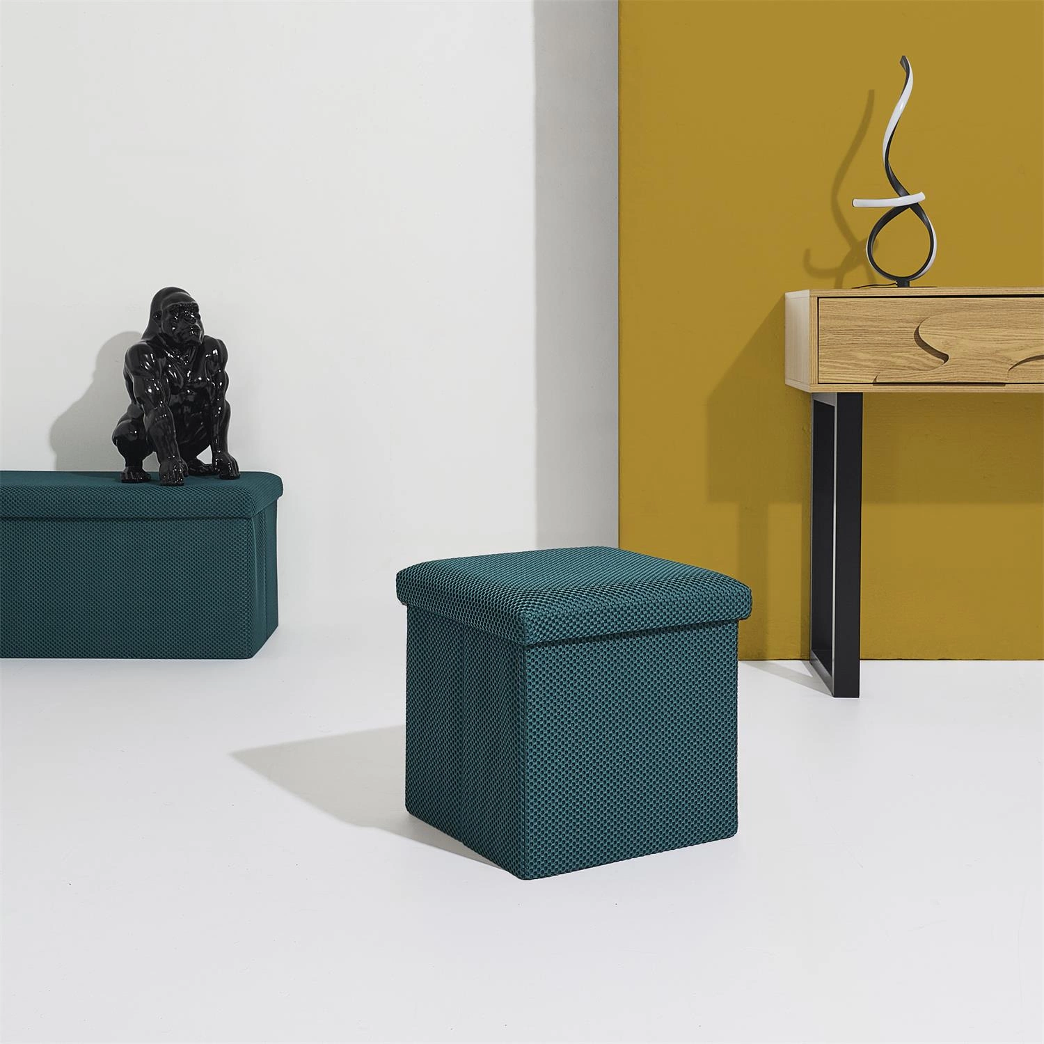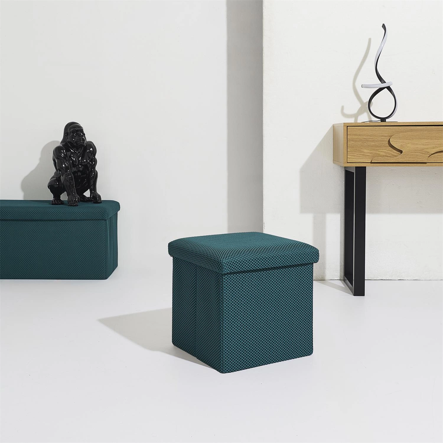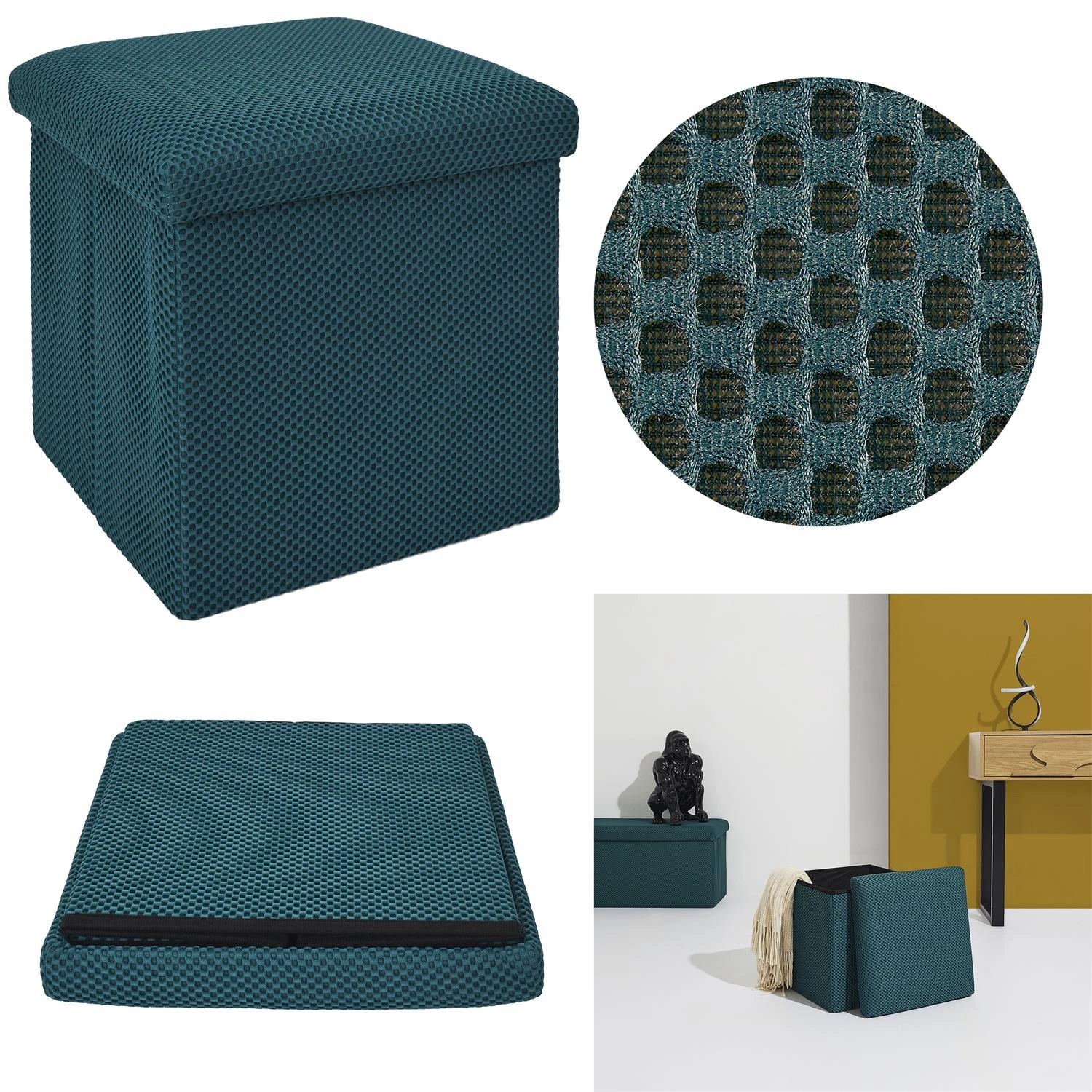 Pufa se schovkou Vels Atom od značky Intesi je čtvercové, skládací sedátko o rozměrech 38×38×38 cm, vyrobené z měkké látky v tyrkysové barvě. Moderní design a praktický úložný prostor z ní dělají ideální volbu do předsíně, dětského nebo studentského pokoje. Stabilní konstrukce zajišťuje pohodlné používání a nosnost až 80 kg, zatímco možnost složení umožňuje úsporu místa, když pufu právě nepotřebujete.