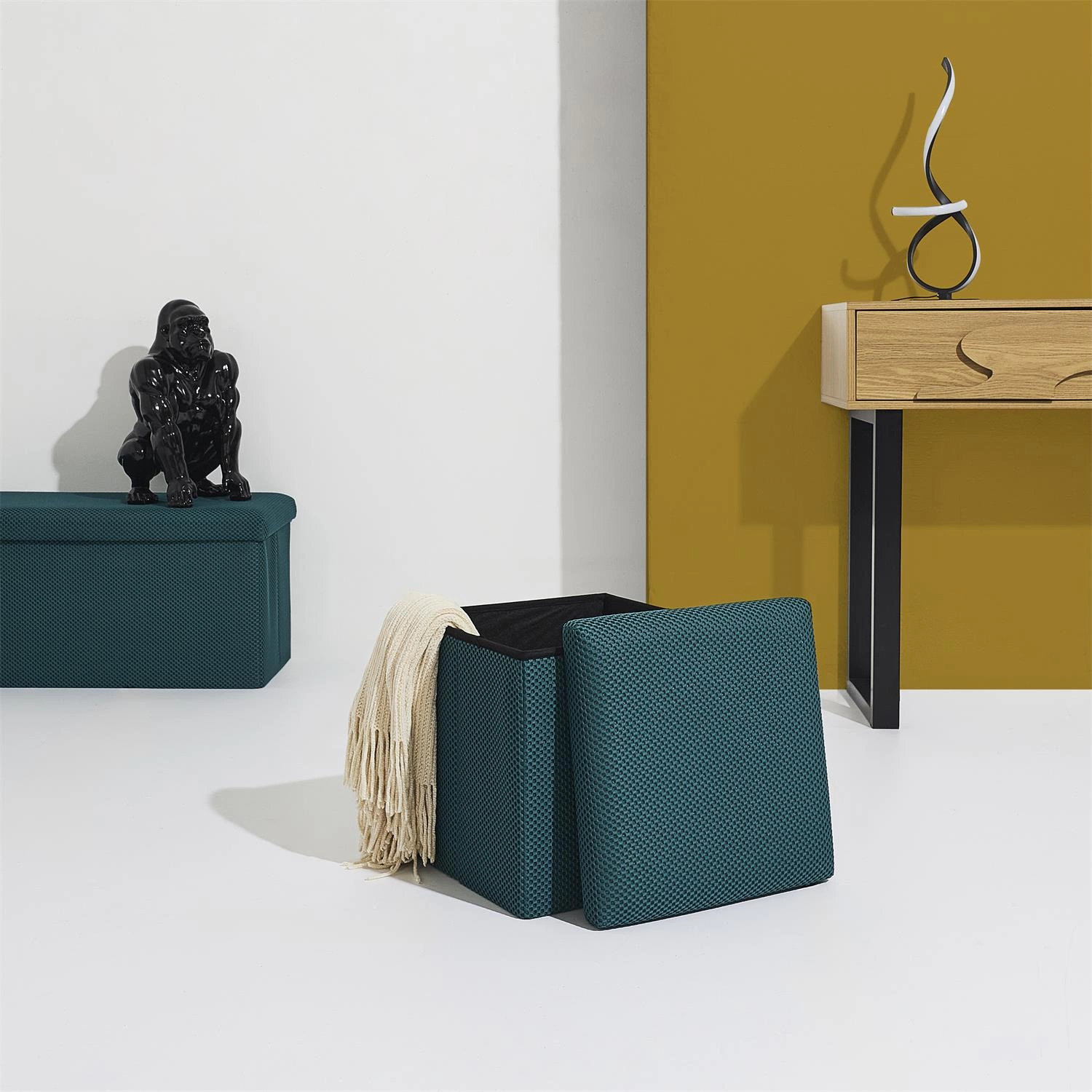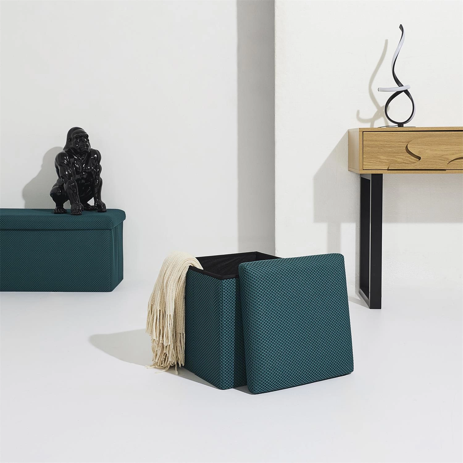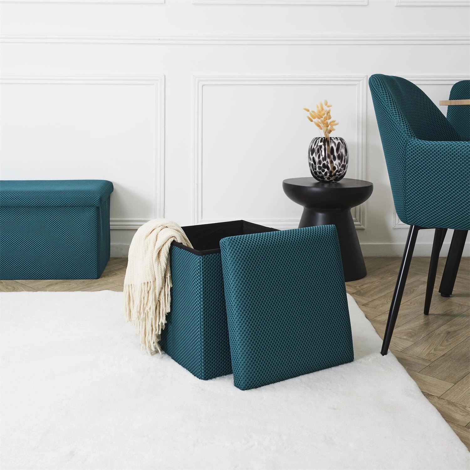 Pufa se schovkou Vels Atom od značky Intesi je čtvercové, skládací sedátko o rozměrech 38×38×38 cm, vyrobené z měkké látky v tyrkysové barvě. Moderní design a praktický úložný prostor z ní dělají ideální volbu do předsíně, dětského nebo studentského pokoje. Stabilní konstrukce zajišťuje pohodlné používání a nosnost až 80 kg, zatímco možnost složení umožňuje úsporu místa, když pufu právě nepotřebujete.