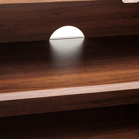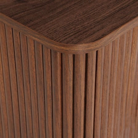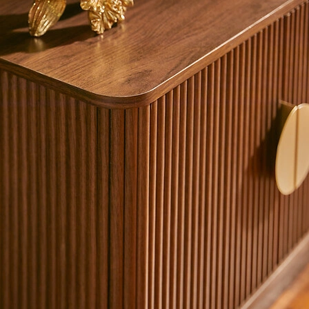 Dřevěná RTV skříňka Wany byla navržena ve stylu japandi, který spojuje minimalistickou jednoduchost s útulností přírodních materiálů. Svislé frézování na čelech nejen dodává vizuální lehkost, ale zároveň dělá z tohoto nábytku stylový dekorativní prvek každého interiéru. Univerzální, obdélníková horní deska o šířce 140 cm umožňuje pohodlně umístit televizi až do 86 palců, zatímco jemný lesk polomatné povrchové úpravy zvýrazňuje eleganci ořechového odstínu.
