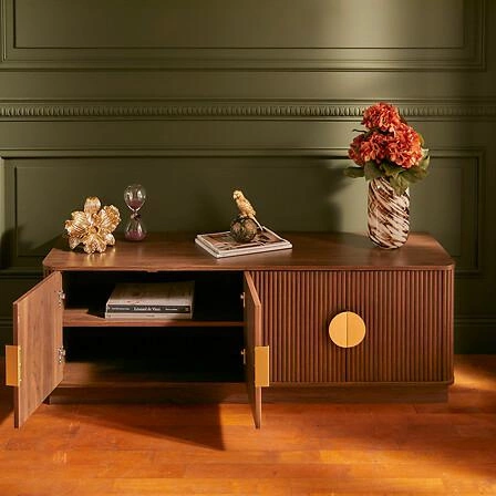 RTV skříňka Wany 140 cm od značky Atmosphera je ideální volbou pro milovníky stylu japandi, kteří hledají harmonii mezi funkčností a jedinečnou estetikou. Nábytek v hlubokém, tmavě hnědém odstínu ořechu zaujme svisle frézovanými čely a šířkou 140 cm, díky čemuž je perfektní jako televizní stolek do obývacího pokoje nebo ložnice. Volně stojící konstrukce a polomatná povrchová úprava dodávají skříňce nadčasovou eleganci a promyšlené vnitřní uspořádání zajišťuje pohodlí při každodenním používání.