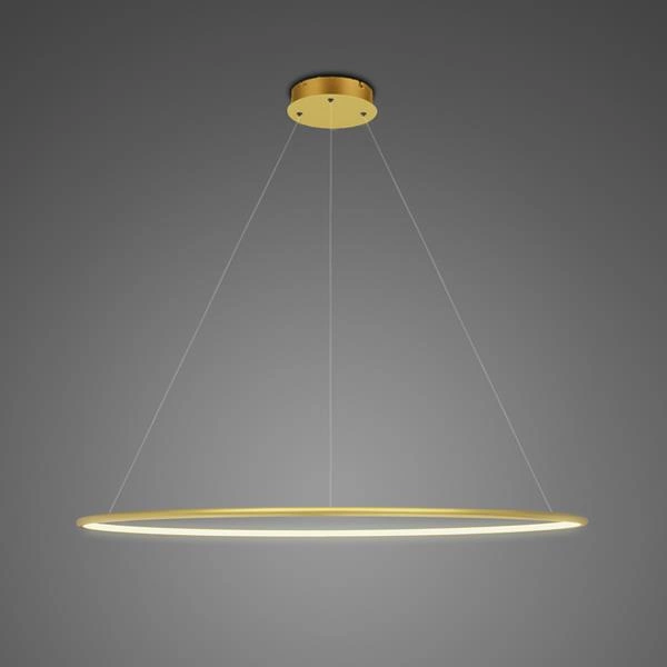 Stropní LED lampa kulatá zlatá No.1 100 cm Altavola Design je moderní světelný prvek, který spojuje minimalistický design s pokročilou LED technologií. Vyrobena z hliníku a silikonu, s působivým průměrem 100 cm a nastavitelnou výškou zavěšení až do 120 cm, je skvělou volbou do obývacího pokoje, jídelny nebo nad jídelní stůl v kuchyni. Zlaté provedení dodává lampě jemnou eleganci, zatímco integrovaný LED zdroj (38W, 4000K, 2605lm) zajišťuje jasné, úsporné a komfortní osvětlení.