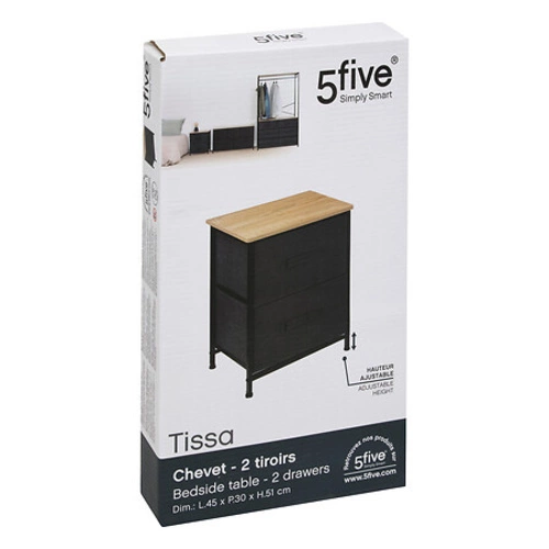 Noční stolek Tissa od značky 5five simply smart je moderní kus nábytku do ložnice, který spojuje funkčnost s minimalistickým designem. Kompaktní šířka 45 cm a výška 51 cm zajišťují, že perfektně zapadne jak do menších, tak i větších ložnic. Vyniká elegantní kombinací černé a šedé barvy a praktickými dvěma zásuvkami, které pomáhají udržet pořádek kolem postele.
