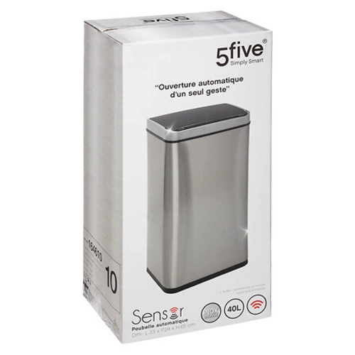 Automatický odpadkový koš 5five simply smart 40 l je praktickým a hygienickým řešením do kuchyně nebo koupelny, které usnadňuje každodenní třídění odpadu. Vyrobený z odolného kovu a ABS plastu v elegantní stříbrné barvě vyniká obdélníkovým tvarem a bezdotykovým systémem otevírání. Díky objemu 40 litrů je ideální jak do domácnosti, tak do kanceláře nebo pracovny – zajistí pohodlné používání i pro větší rodiny nebo týmy.