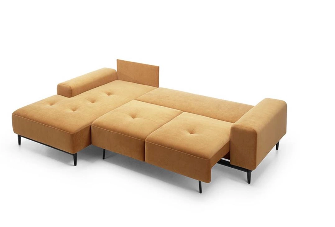 Rohová pohovka Revon na první pohled upoutá výraznou žlutou barvou, která okamžitě oživí interiér a dodá mu pozitivní atmosféru. Sametová látka je příjemná na dotek a efektně rozptyluje světlo, což dodává místnosti elegantní vzhled. Moderní linie nábytku, zvýrazněné černými nohami a minimalistickými područkami, perfektně zapadají do současných trendů bydlení. Díky tomu snadno začleníte rohovou sedačku do moderních, industriálních nebo klasických obývacích pokojů.