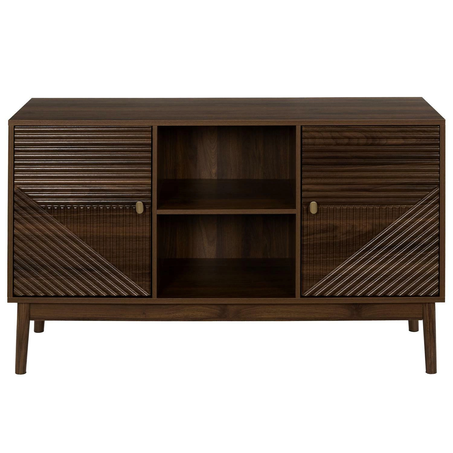 Jedinečný styl komody Tiffany podtrhují ryhované přední plochy, které nábytku dodávají nadčasový, klasický výraz. Tmavý odstín ořechu skvěle ladí s interiéry v klasickém nebo skandinávském stylu, vnáší do místnosti útulnost a eleganci. Obdélníková horní deska je ideální pro rodinné suvenýry, dekorace či lampu, které ještě více zvýrazní osobitý styl vašeho obýváku, ložnice nebo předsíně.