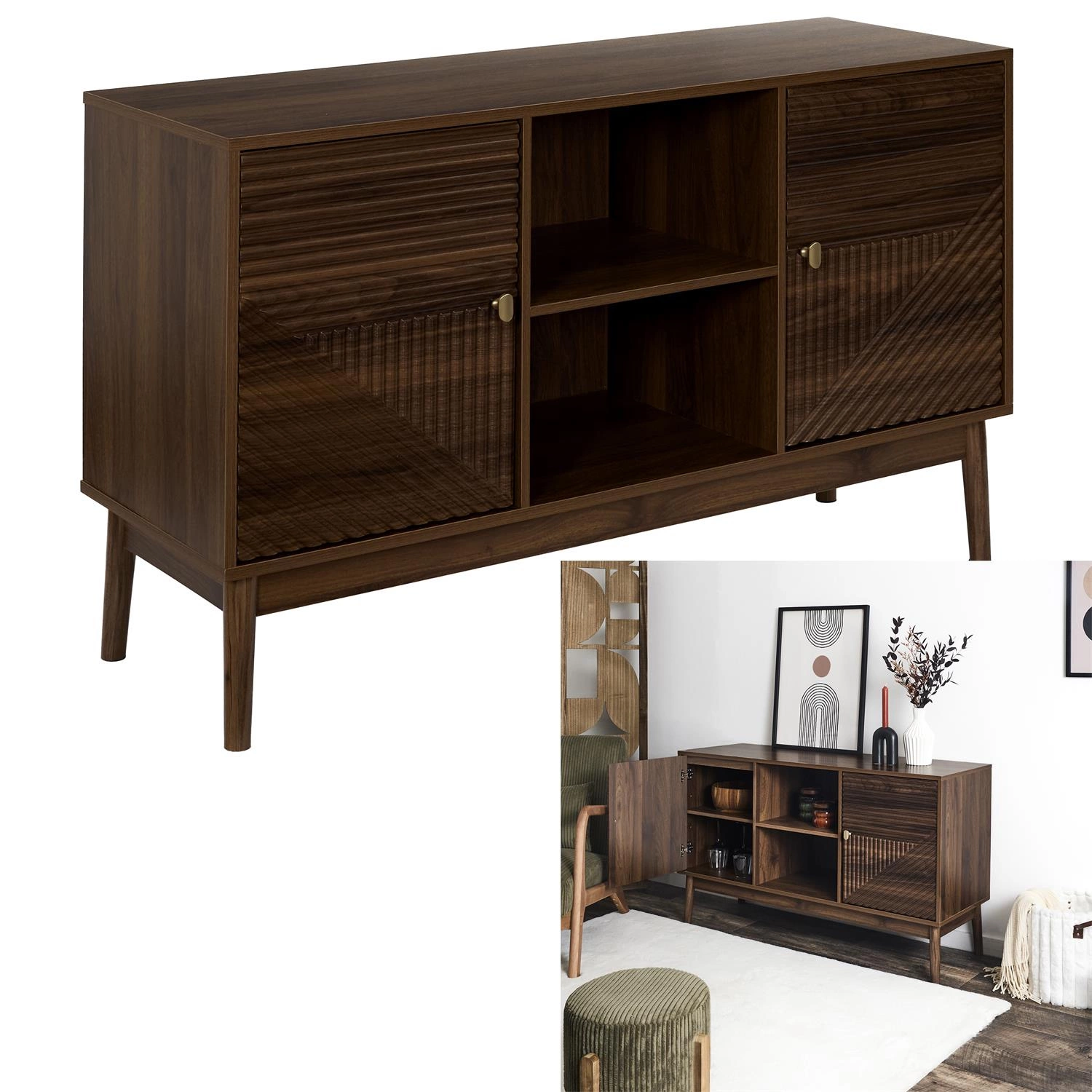 Díky třem prostorným policím nabízí komoda Tiffany ryhovaná ořech pohodlné ukládání dokumentů, oblečení nebo domácích drobností. Šířka 120 cm poskytuje optimální prostor, aniž by zabírala příliš místa. Vysoké, stabilní nohy nejen usnadňují úklid pod komodou – i robotickým vysavačem – ale také dodávají celku lehkost, což oceníte i v menších místnostech.