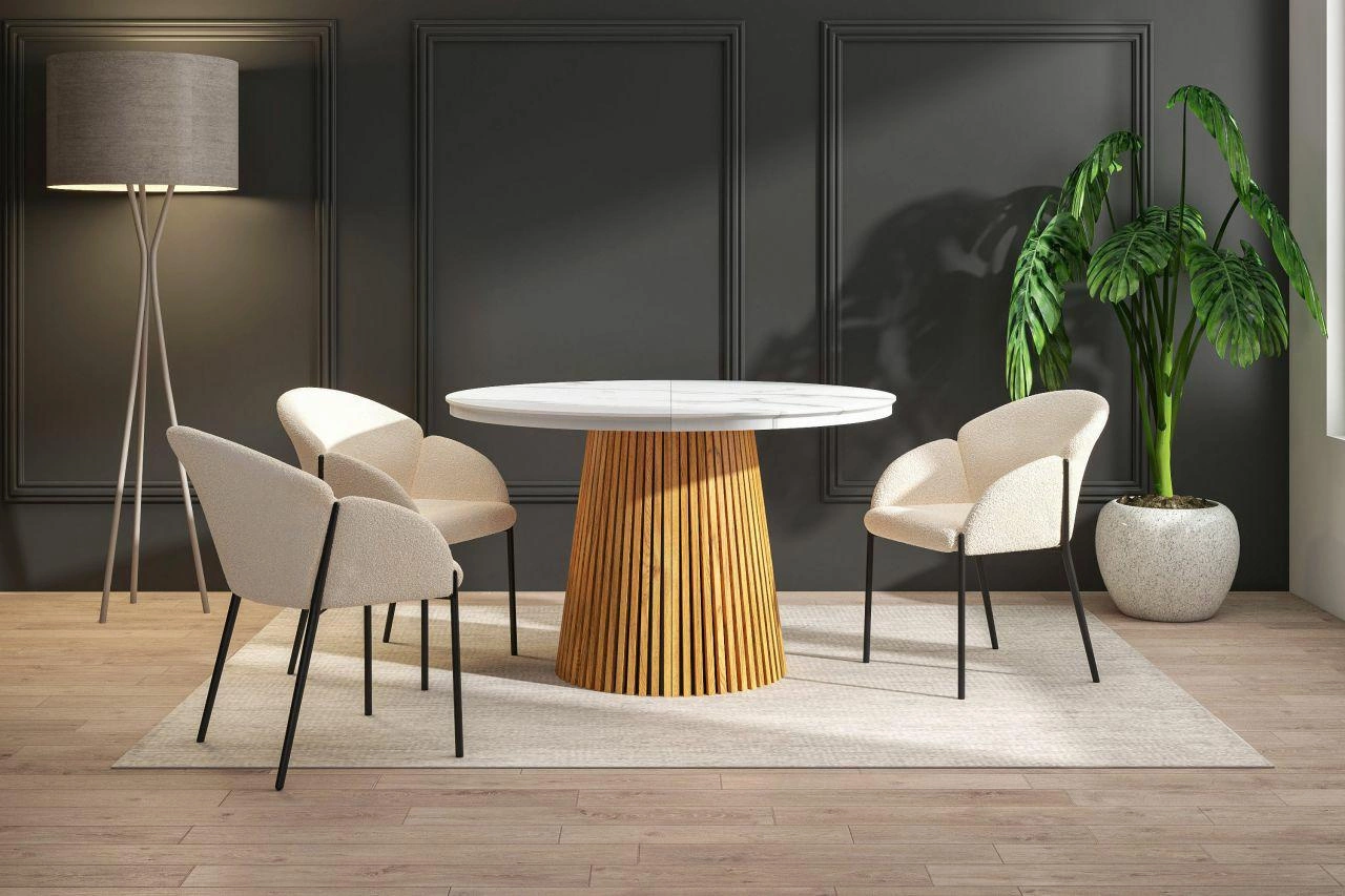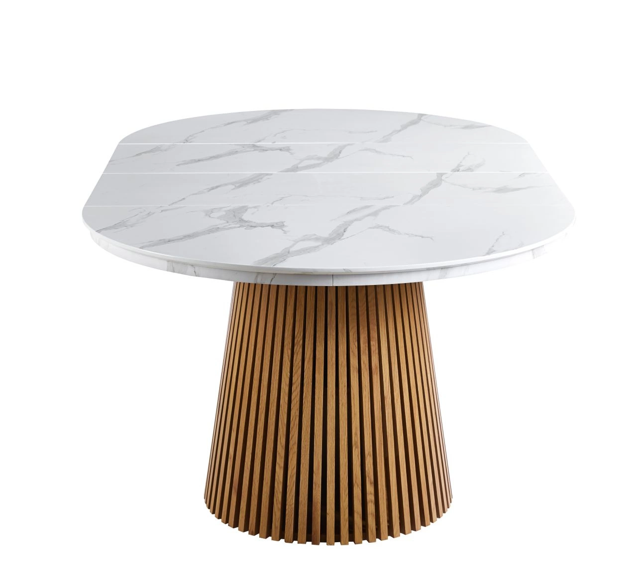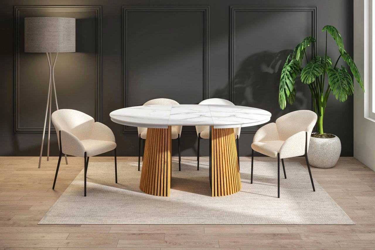 Rozkládací stůl Kyoto od značky Intesi je kulatý jídelní stůl do jídelny i obývacího pokoje, který spojuje moderní design s každodenní funkčností i pohodlím při výjimečných příležitostech. Kulatá deska o průměru 120 cm v imitaci bílého mramoru a stabilní podnož v odstínu přírodního dubu podtrhují elegantní charakter stolu. Díky rozkládací konstrukci lze desku stolu prodloužit až na 200 cm, což umožňuje pohodlně pohostit více osob u jednoho stolu.