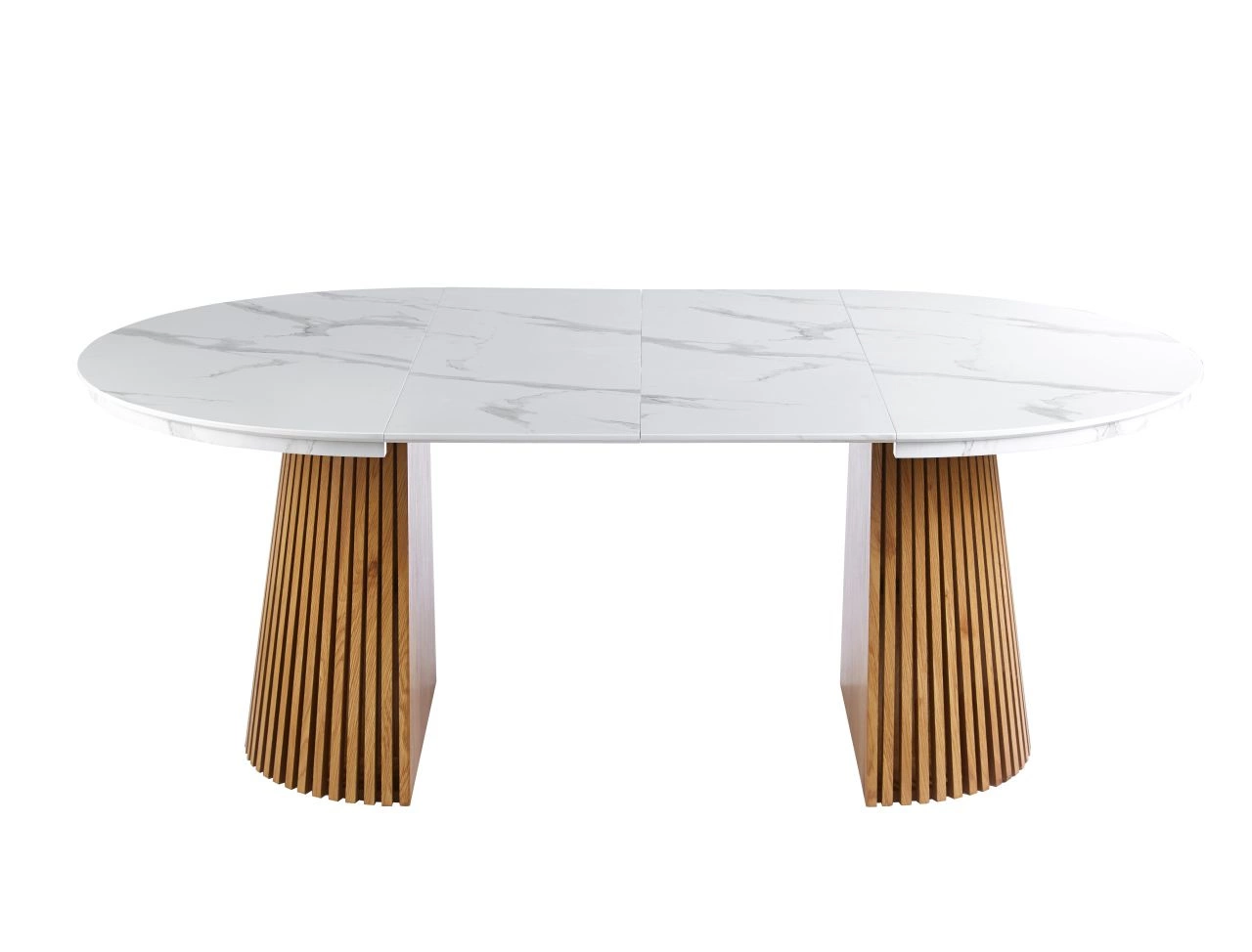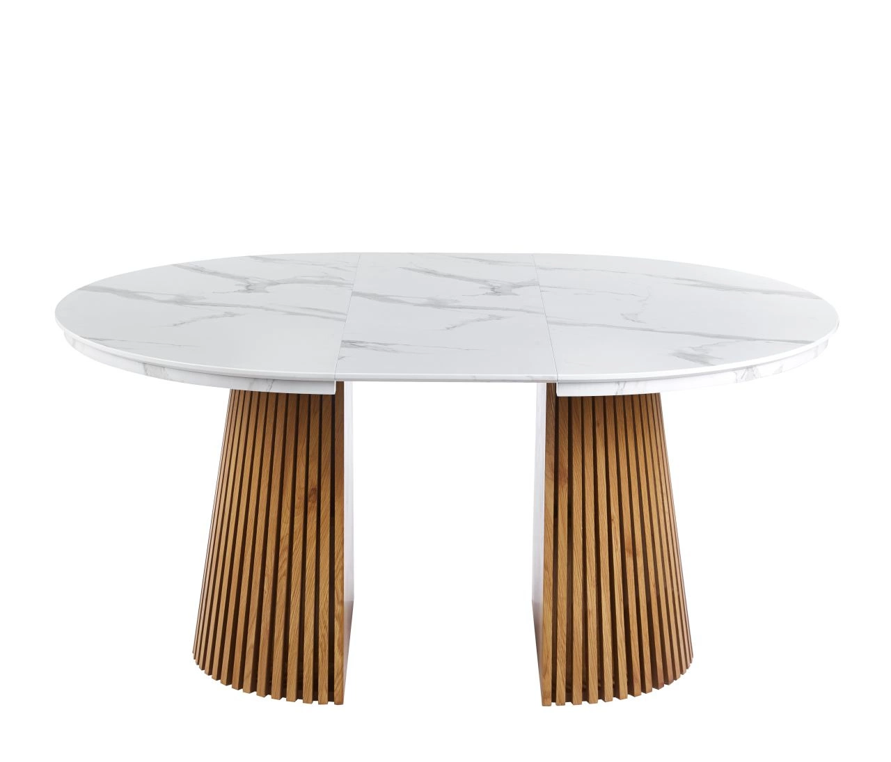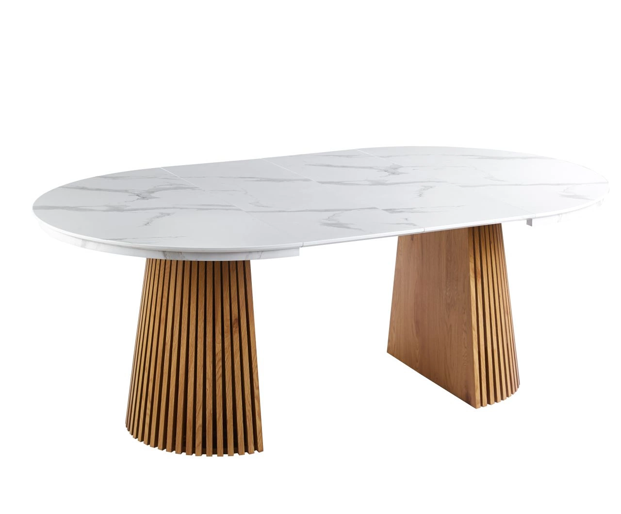 Rozkládací stůl Kyoto od značky Intesi je kulatý jídelní stůl do jídelny i obývacího pokoje, který spojuje moderní design s každodenní funkčností i pohodlím při výjimečných příležitostech. Kulatá deska o průměru 120 cm v imitaci bílého mramoru a stabilní podnož v odstínu přírodního dubu podtrhují elegantní charakter stolu. Díky rozkládací konstrukci lze desku stolu prodloužit až na 200 cm, což umožňuje pohodlně pohostit více osob u jednoho stolu.