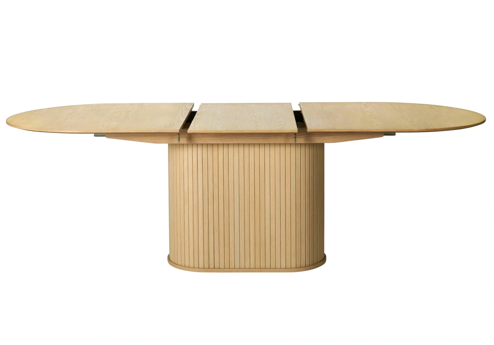 Rozkládací stůl Lano značky UNIQUE Furniture je výjimečný kus nábytku do jídelny, který spojuje moderní design s funkčností. Oválná deska o působivé délce 230 cm je vyrobena z MDF desky potažené přírodní dubovou dýhou a celý stůl je postaven na stabilní, jedné noze. Díky rozkládacímu mechanismu a přídavným deskám v balení získáte flexibilitu a pohodlí při pořádání rodinných setkání nebo oslav s přáteli.