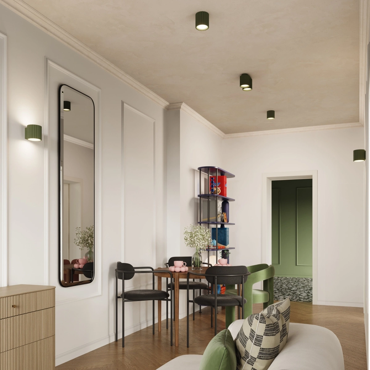 Kulatý stropní plafon AURA 1 v odstínu olivově zelené je ideální volbou pro ty, kteří chtějí do svého domova vnést svěžest a jedinečný styl. Toto moderní stropní svítidlo je decentním, ale zároveň výrazným dekorativním prvkem, který rozbíjí stereotyp klasických barev. Perfektně ladí jak se světlými, tak s tmavšími aranžmá a dodává místnosti útulnost i osobitý charakter.