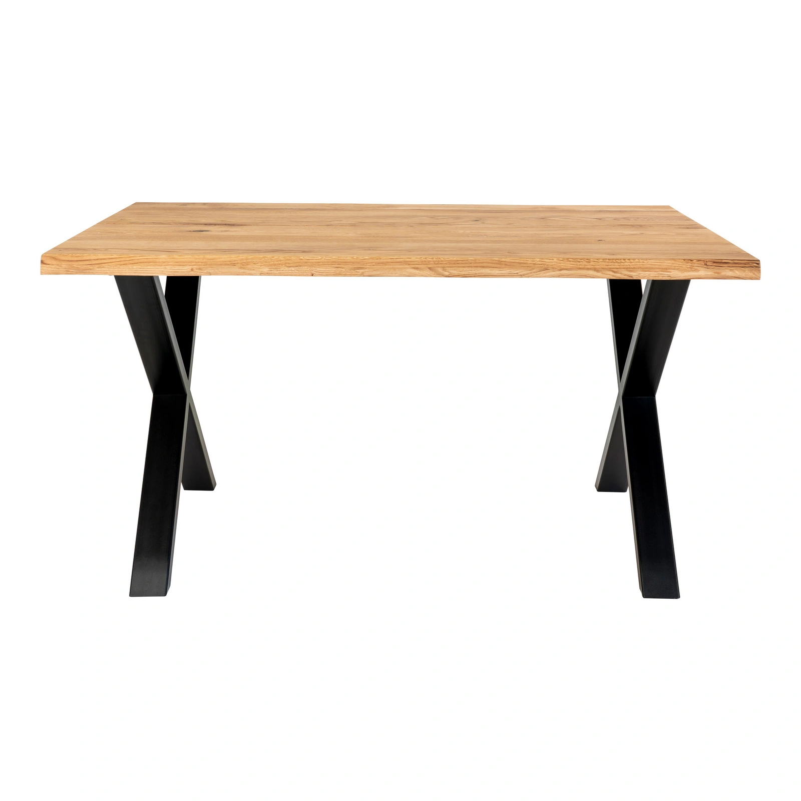 Deska stolu Toulon je vyrobena z masivního dubového dřeva v přírodním odstínu, díky čemuž má každý kus jedinečnou kresbu a teplý tón. Kontrastní černé ocelové nohy podtrhují loftový styl nábytku a dodávají interiéru moderní, industriální charakter. Tento stůl se skvěle hodí jak do světlých skandinávských interiérů, tak k surové cihle, betonu nebo černým doplňkům.