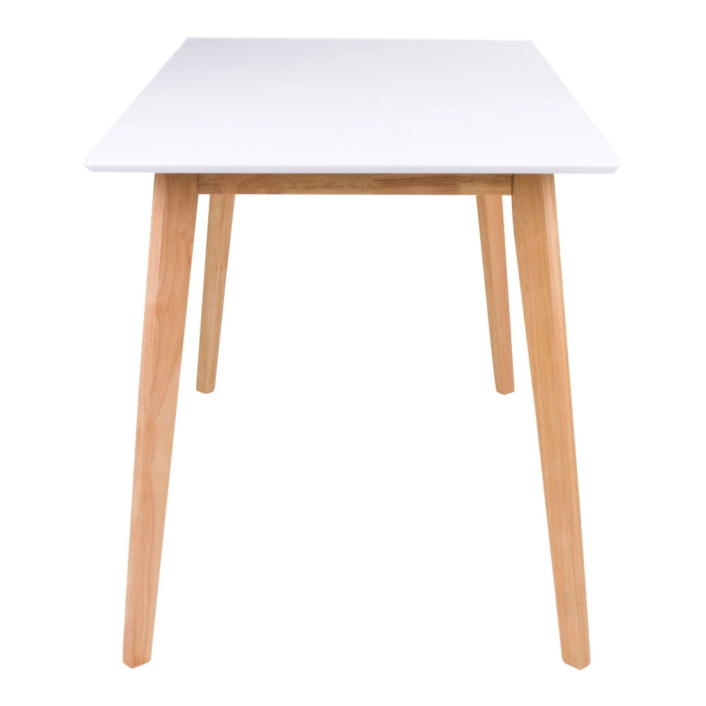 Stůl Vojens od značky House Nordic je kompaktní jídelní stůl o rozměrech 70×120×75 cm, který spojuje bílou polomatnou desku s přírodními dřevěnými nohami. Obdélníková deska z laminované desky se snadno čistí a štíhlá podnož z kaučukového dřeva dodává stolu lehkost a stabilitu. Jde o moderní jídelní stůl do kuchyně nebo menšího obývacího pokoje, u kterého si pohodlně vychutnáte každodenní domácí jídla.