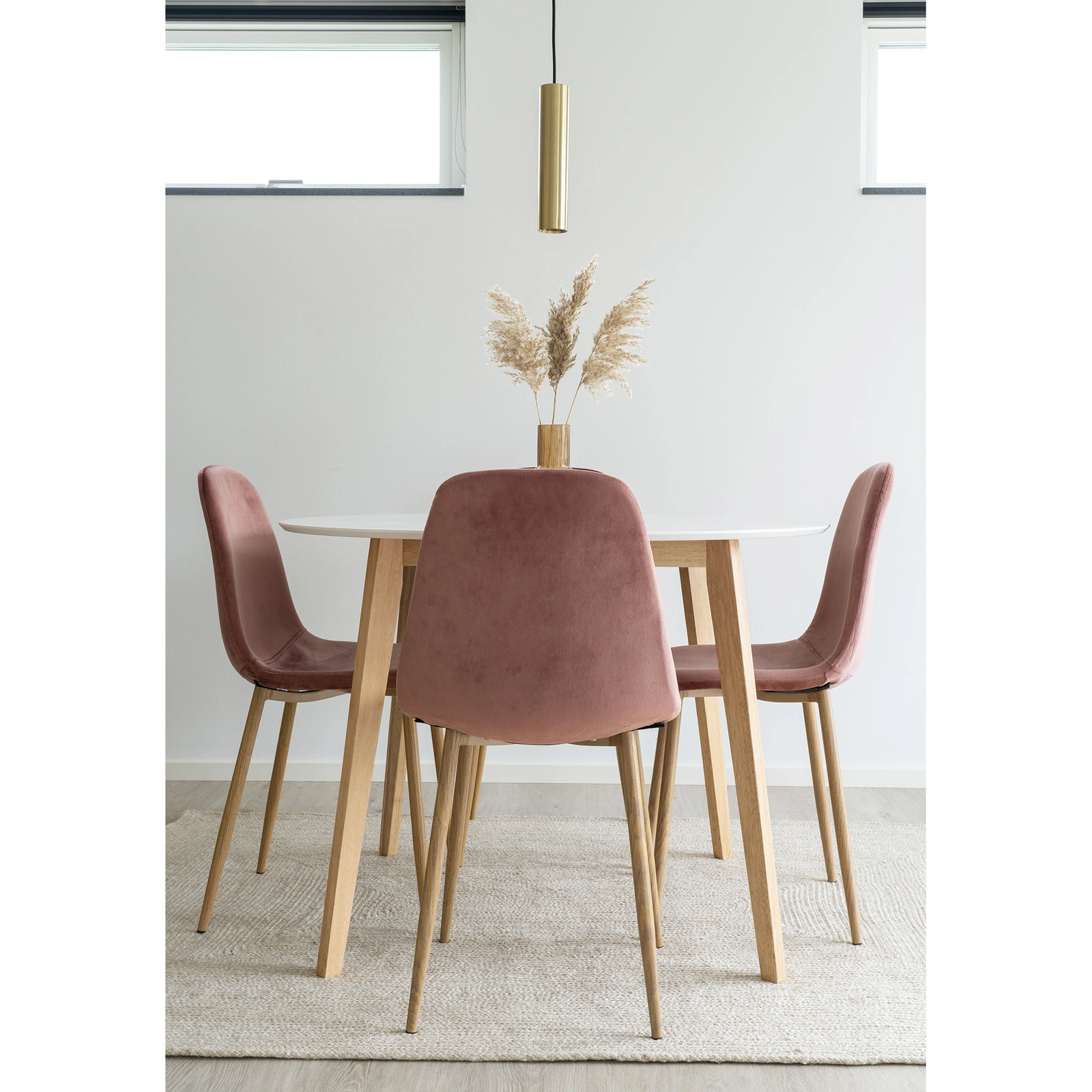 Okrąhlý stůl Vojens je laděn v moderním stylu, který perfektně zapadá do světlých, vzdušných a uklizených interiérů. Bílá, polomatná deska jemně odráží světlo, díky čemuž opticky prosvětluje kuchyni nebo obývací pokoj. Přírodní odstín dřevěné podnože dodává celku útulnost a teplo a vytváří harmonické spojení vhodné jak do moderních, tak i do klasických aranžmá.