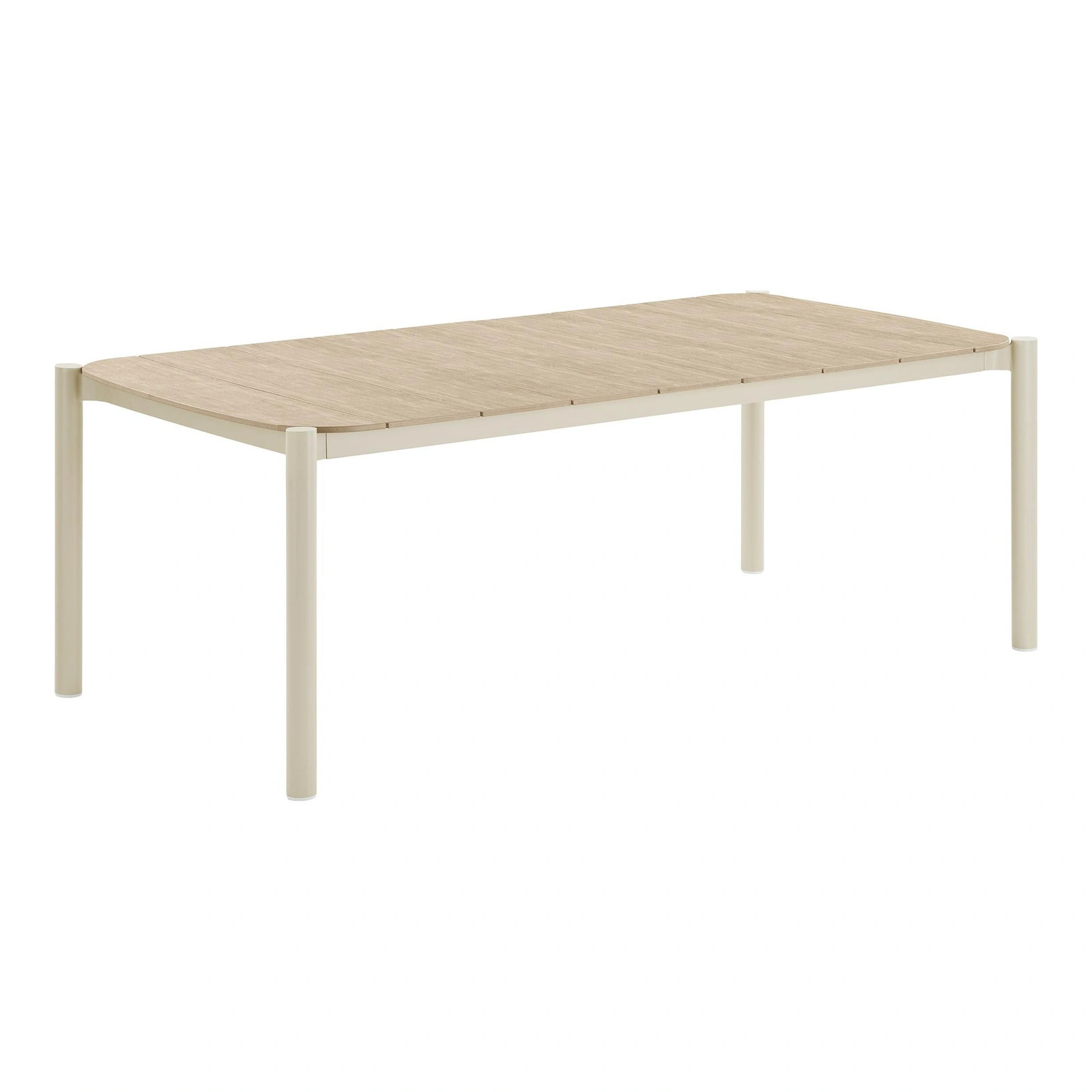 Kombinace pískové podnože a přírodního odstínu desky dodává stolu skandinávský charakter – interiér působí svěže, lehce a útulně. Polomatná povrchová úprava neodráží silně světlo, takže plocha vypadá elegantně jak při denním, tak při večerním osvětlení. Takový moderní stůl se harmonicky sladí se světlými židlemi, dřevěnou podlahou nebo doplňky z lnu a bavlny a vytvoří příjemný prostor pro společné stolování a odpočinek.