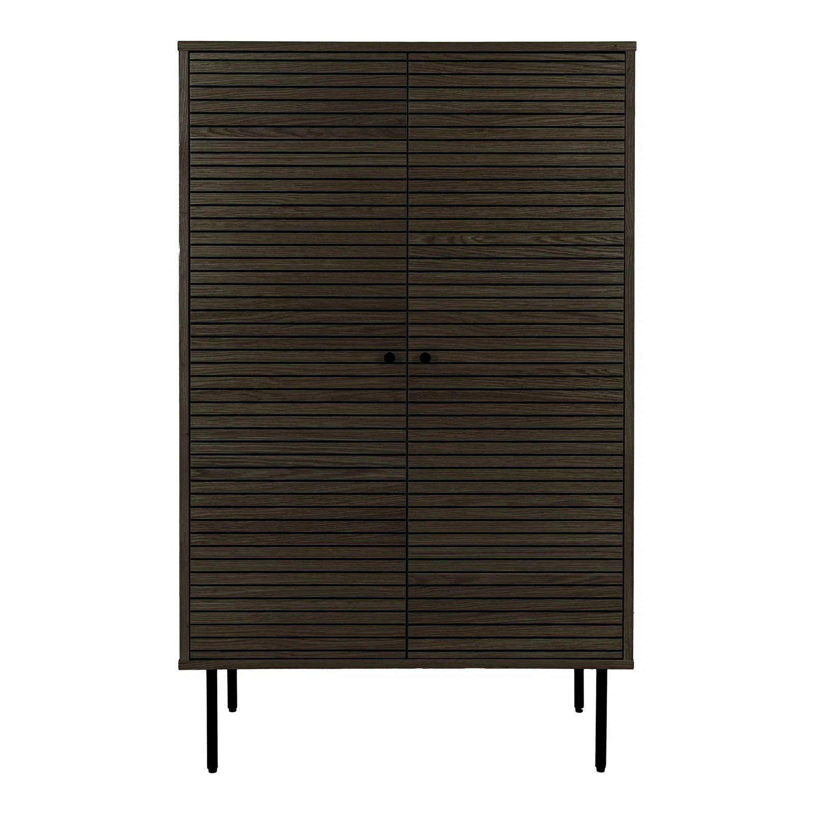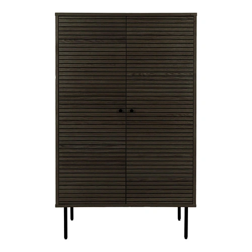 Komoda Kyoto od značky House Nordic je vysoká, skandinávská dřevěná komoda o šířce 80 cm, s povrchem z dubové dýhy v kouřovém odstínu. Má drážkované čelní plochy, dvě prostorné skříňky a černé, vysoké ocelové nohy, díky nimž působí nábytek vzdušně a je praktický pro každodenní používání.
