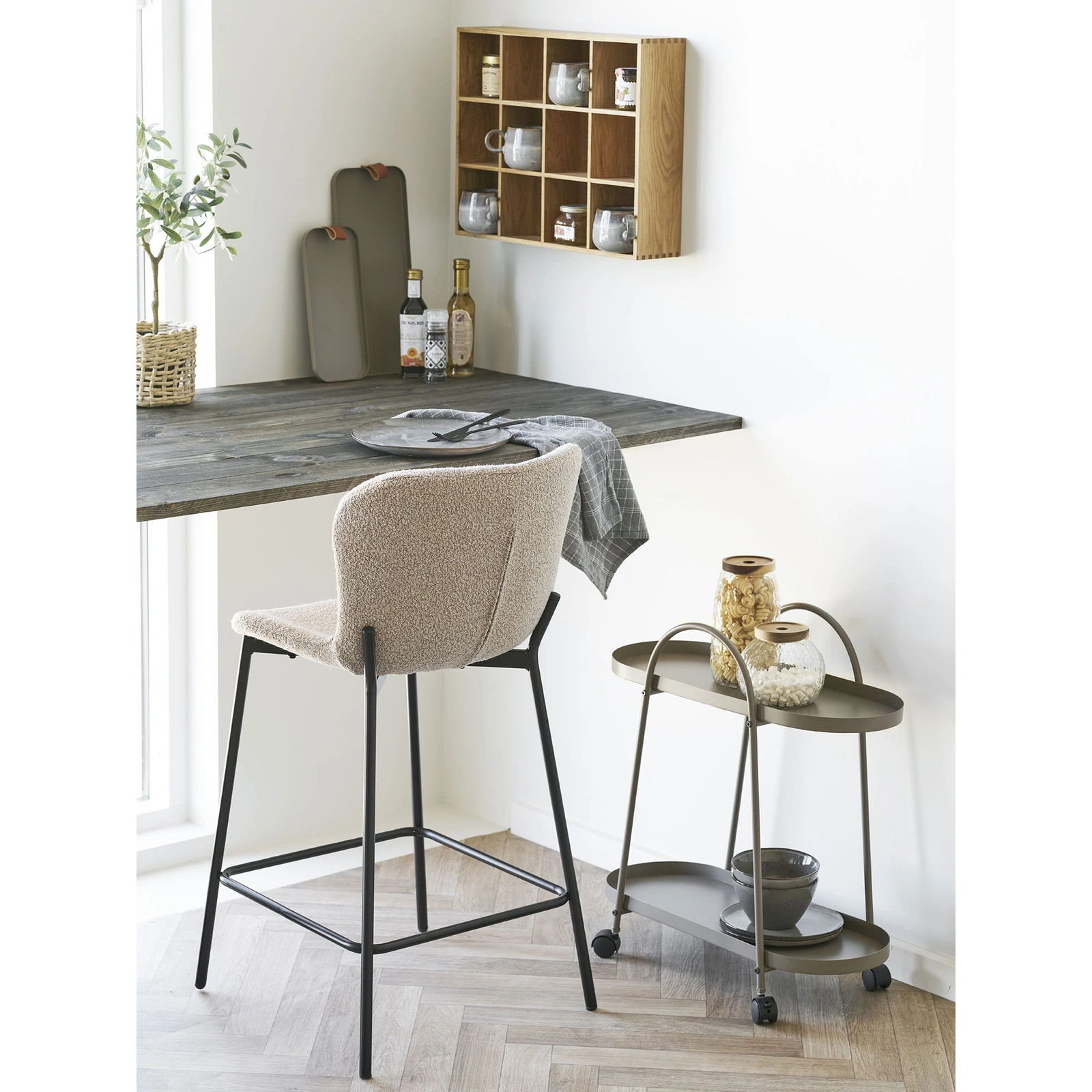 Béžové čalounění typu bouclé vnáší do interiéru útulnost a jemnou eleganci. Typická smyčková struktura materiálu je měkká na dotek, takže sedák doslova vybízí k usednutí. Světlý odstín béžové se krásně kombinuje s bílými kuchyněmi, dřevěnými pracovními deskami i černými doplňky a dodává aranžmá jednotný, moderní charakter. Je to skvělá volba, pokud hledáte čalouněný barový hoker do kuchyně, který nepůsobí „technicky“, ale domácky a stylově.