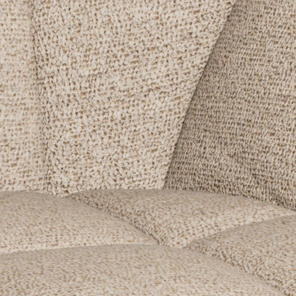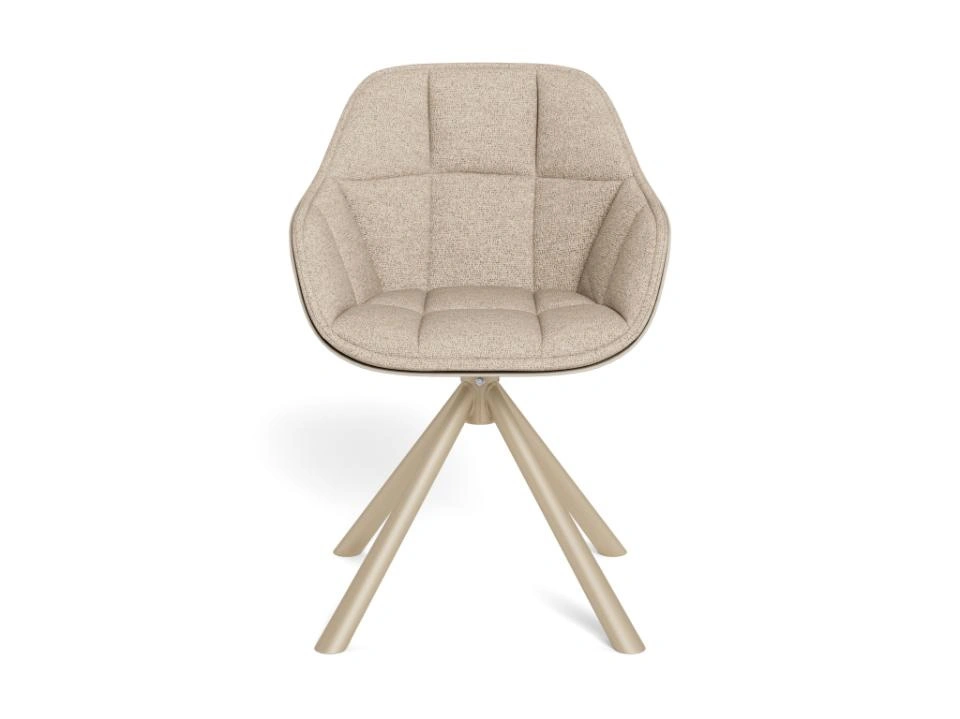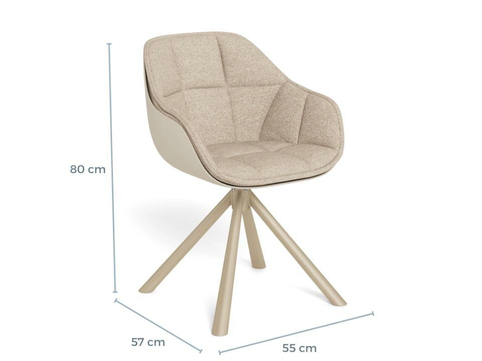 Opěradlo a područky tvoří objímající, komfortní tvar, který přímo vybízí posadit se na delší dobu – k rodinnému obědu, dlouhé večeři s přáteli nebo k ranní kávě v kuchyni. Béžové čalounění s výraznější strukturou zvyšuje dekorativní hodnotu, takže se židle může stát jedním z klíčových prvků vybavení interiéru.