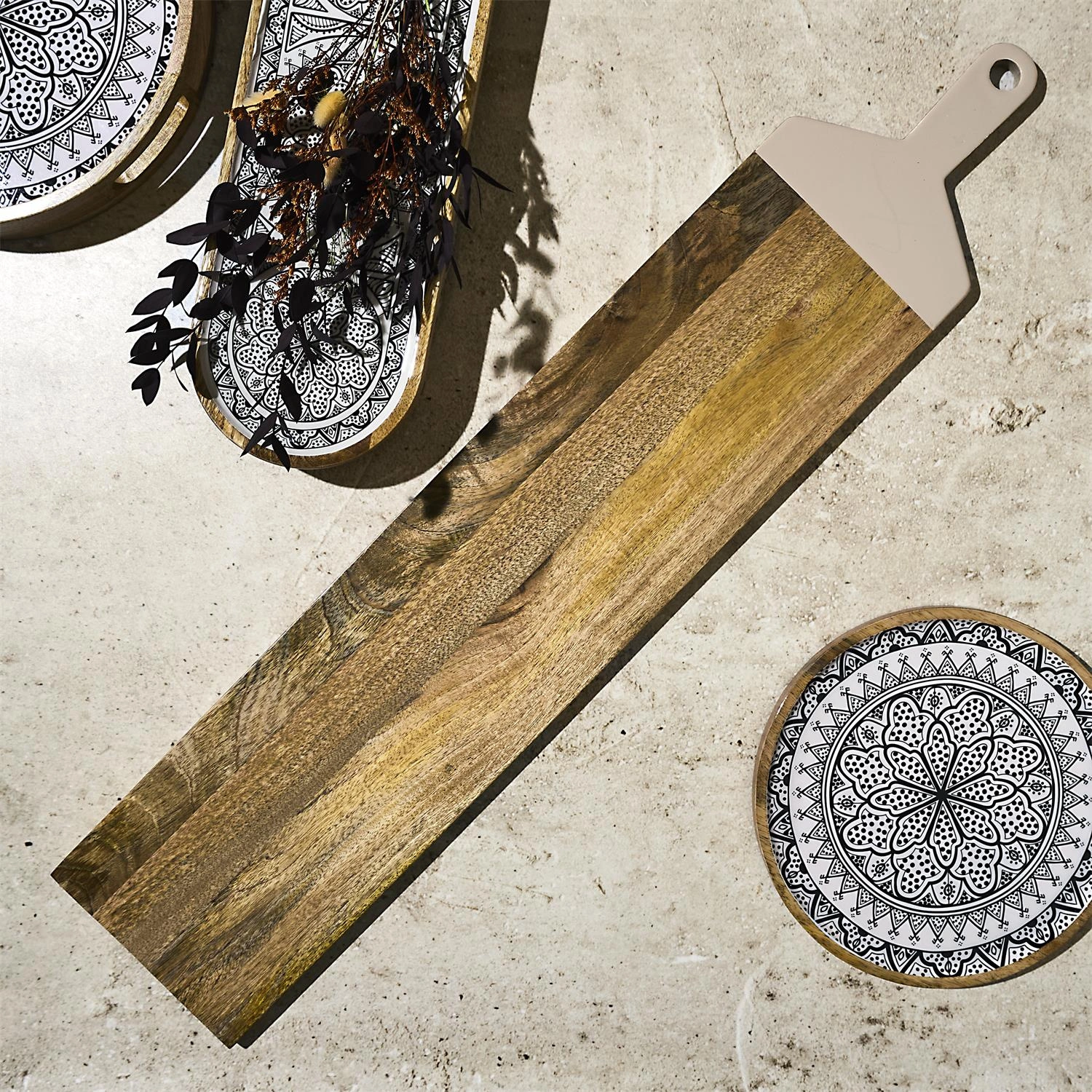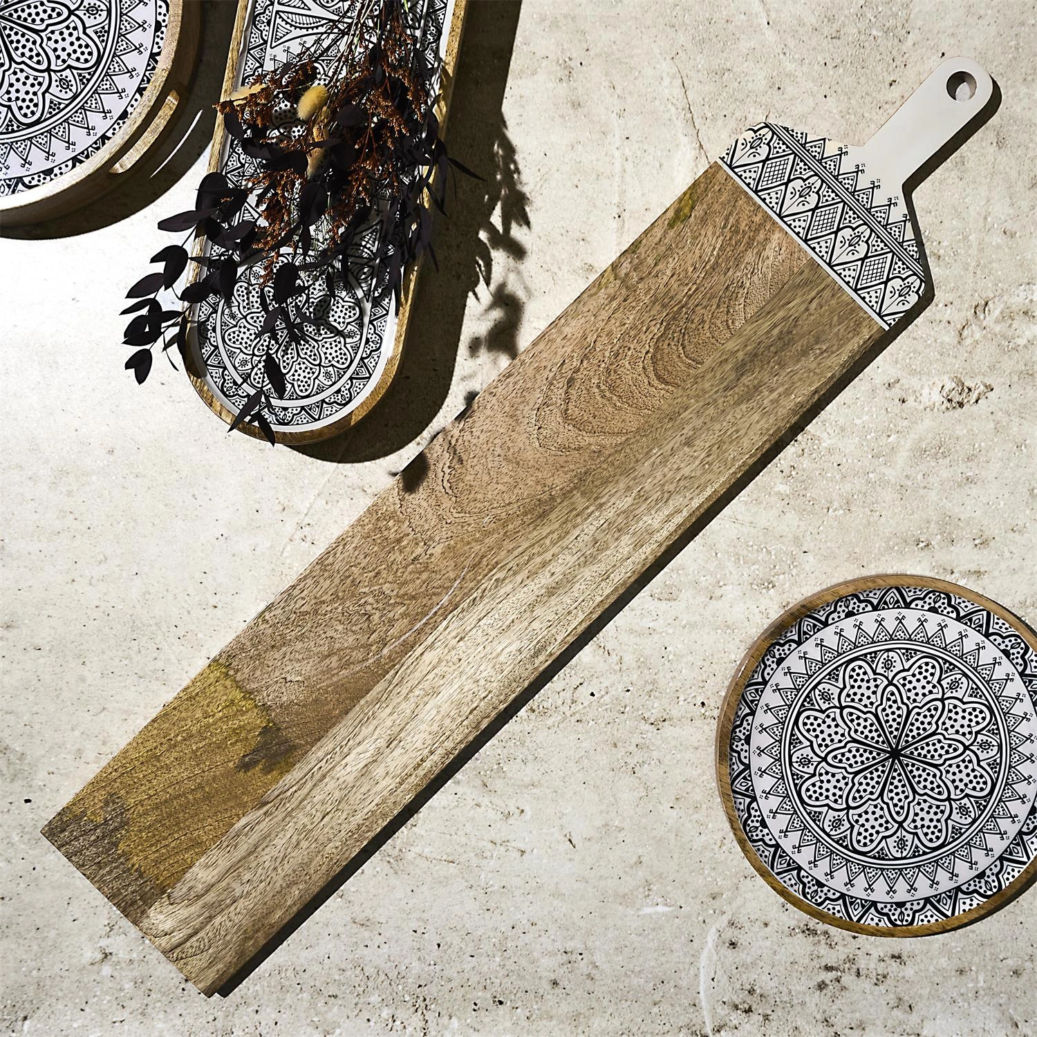 Na rukojeti desky byl použit dekorativní vzor inspirovaný orientálními motivy, který narušuje jednoduchou formu a dodává celku výrazný charakter. Tento detail proměňuje kuchyňské prkénko také v dekoraci – skvěle vypadá opřené o stěnu na kuchyňské lince nebo vystavené na konzolovém stolku v obýváku.