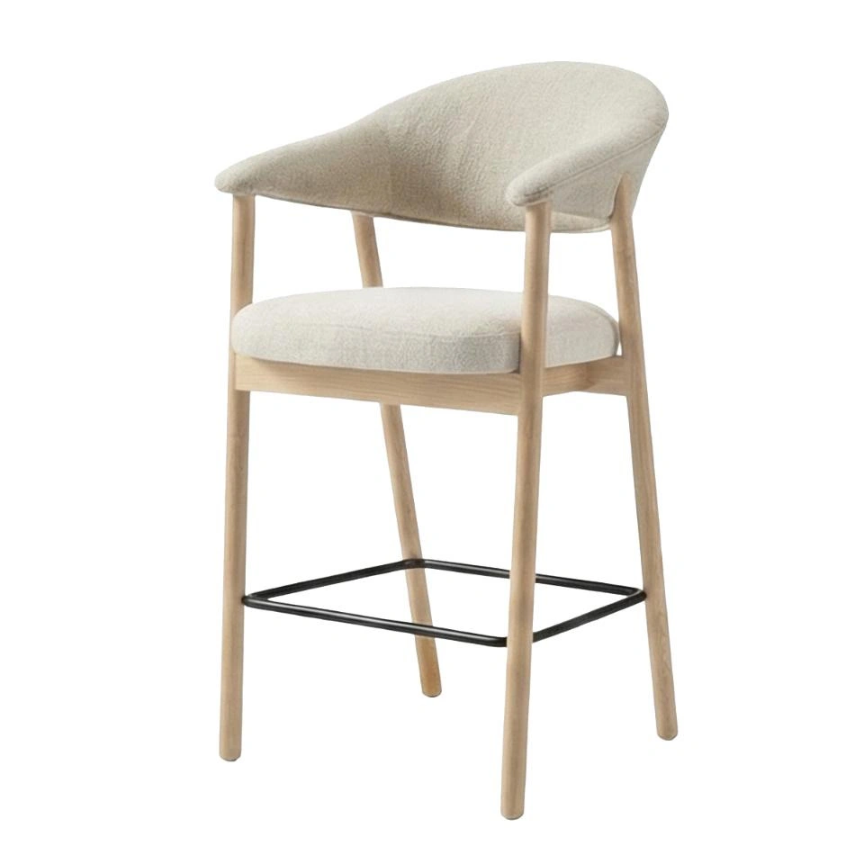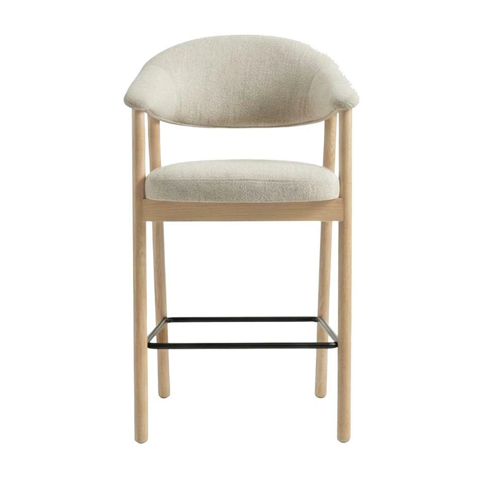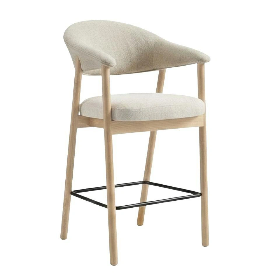 Barová židle – hoker Elk značky UNIQUE je čalouněné barové křeslo v severském stylu, které kombinuje pískové sedákové čalounění s podnožím v dekoru bělený dub. Výška 104 cm z něj dělá ideální hoker do kuchyně nebo k ostrůvku – nabízí pohodlné opěradlo, područky a praktickou opěrku na nohy.