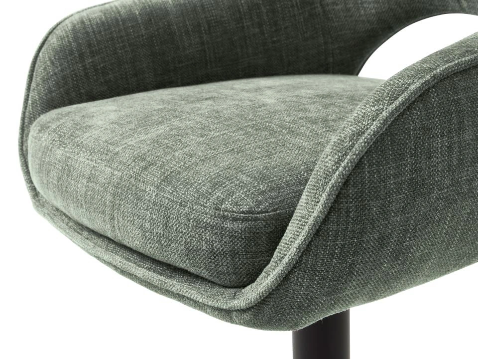 Profilované opěradlo a měkká vrstva pěny pod čalouněním zajišťují pohodlnou oporu zad, což oceníte při rodinných snídaních i posezení s přáteli u ostrůvku. Integrované područky ve výšce cca 78 cm umožňují volně opřít ruce, čímž uleví ramenům a šíji. Praktická opěrka na nohy stabilizuje polohu nohou, takže se sedí přirozeněji a méně únavně.