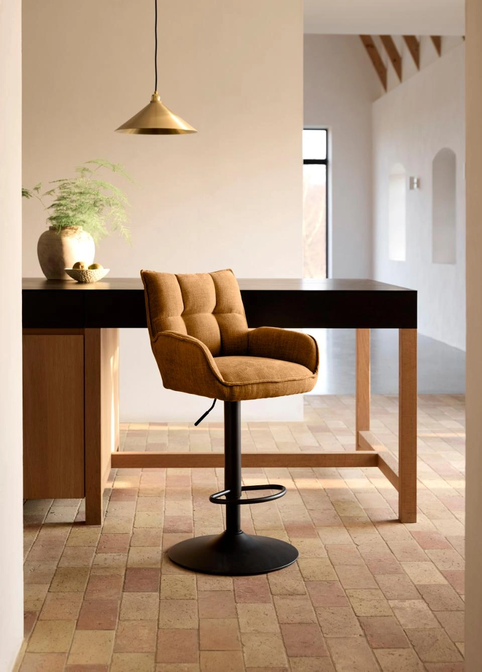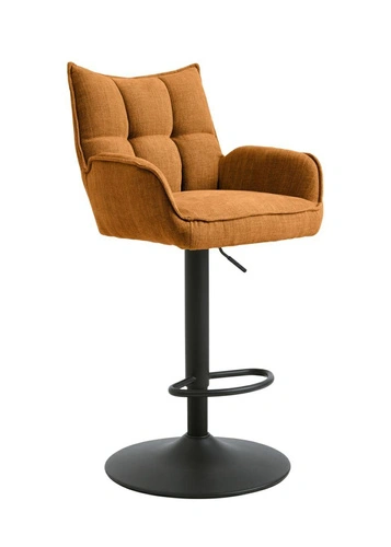 Hoker Marilla terracotta značky UNIQUE je moderní barová židle s opěrkou zad a područkami, navržená k využití u kuchyňského ostrůvku a vysokého jídelního pultu. Čalouněné sedák v teplém odstínu terracotta je doplněn černou kovovou podstavou na jedné noze s praktickou opěrkou na nohy. Nastavitelná výška umožňuje pohodlně přizpůsobit hoker různě vysokým pracovním deskám, zatímco měkká výplň zaručuje komfort i při delším sezení.
