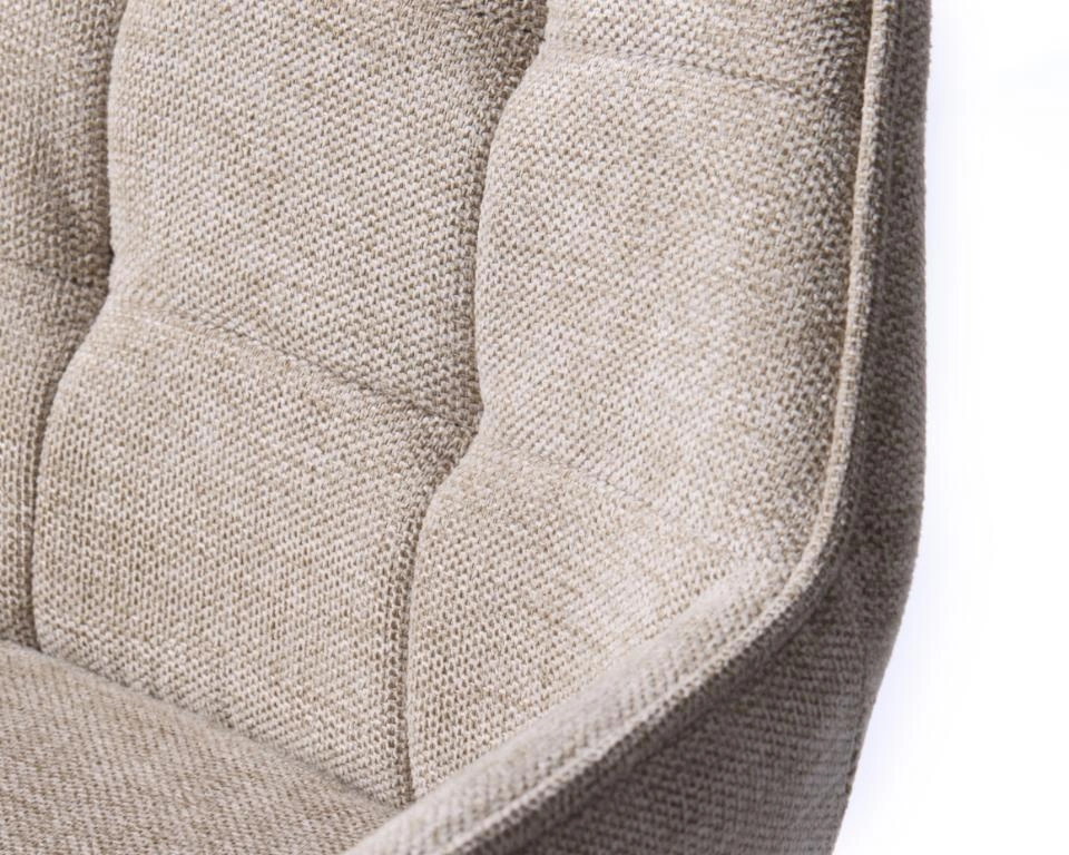 Měkká pěnová výplň a na dotek příjemná látka v pískovém odstínu zajišťují pohodlí i při delších rozhovorech u barového pultu. Látka s výraznější strukturou dodává interiéru útulnost a dobře maskuje drobné známky používání, díky čemuž si hoker dlouho zachová svěží vzhled.