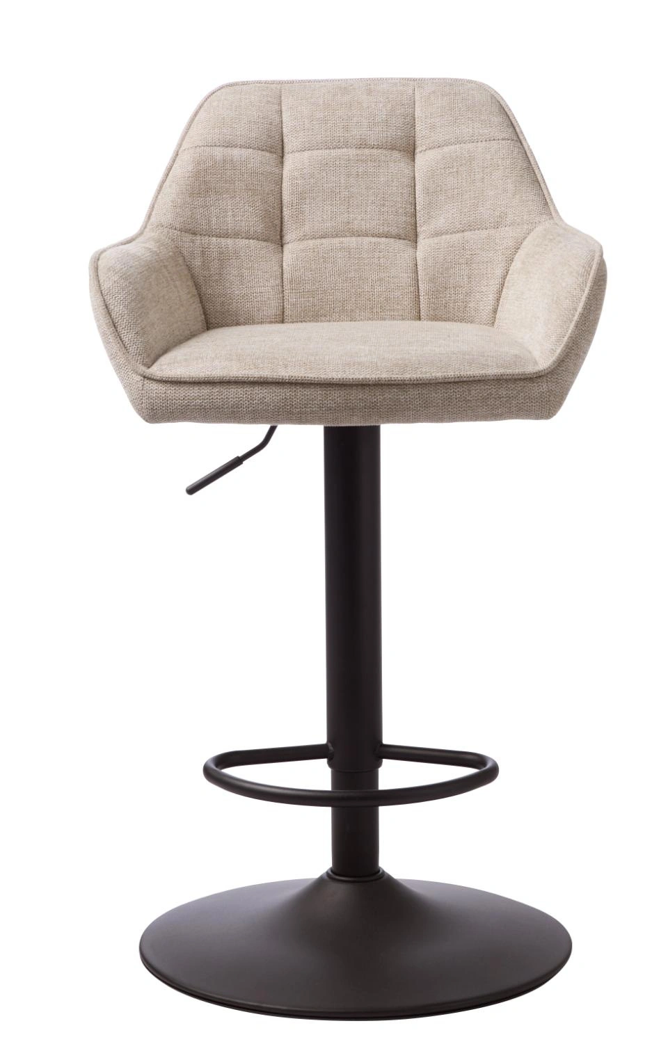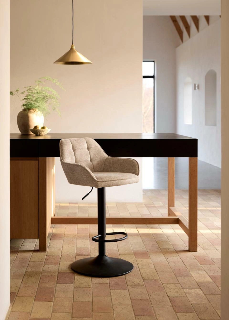 Barová židle Nolan značky UNIQUE je čalouněný hoker v pískové barvě, navržený pro moderní kuchyň a kuchyňský ostrůvek. Stabilní kovová základna v černém polomatu, pohodlné sedák s opěrkou zad a područkami a výškové nastavení zajistí, že ho snadno přizpůsobíte jak nižší snídaňové desce, tak vysokému domácímu baru.